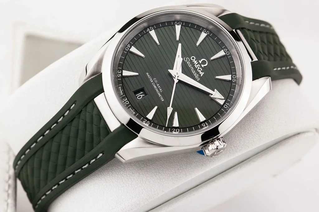 Up for sale is a brand new Omega Aqua Terra 8800 38mm Green Dial on Rubber Strap, reference # 220.12.38.21.10.001 It comes complete with all boxes, papers, booklets, hang tag and Omega Warranty Card dated May 2025.