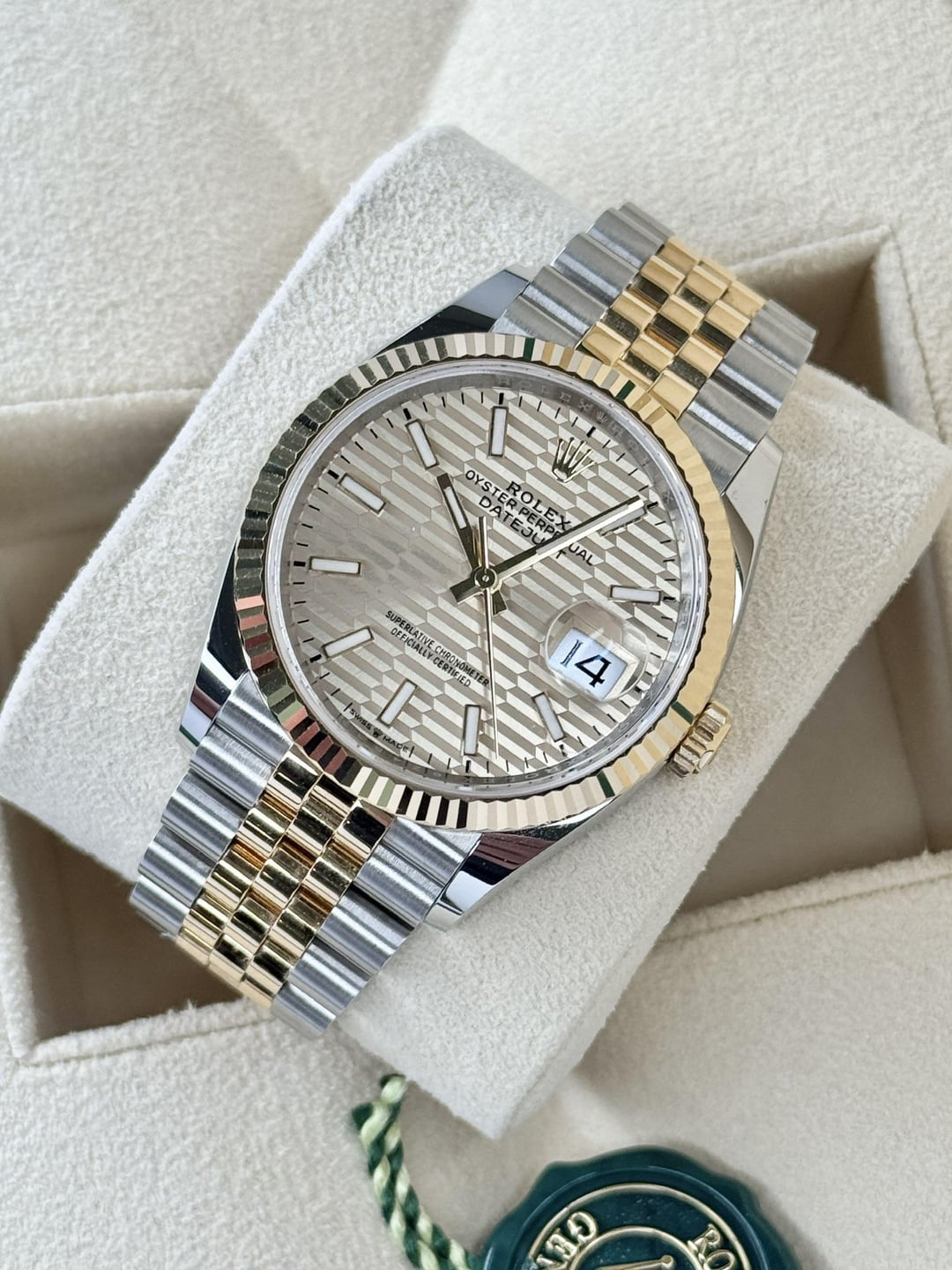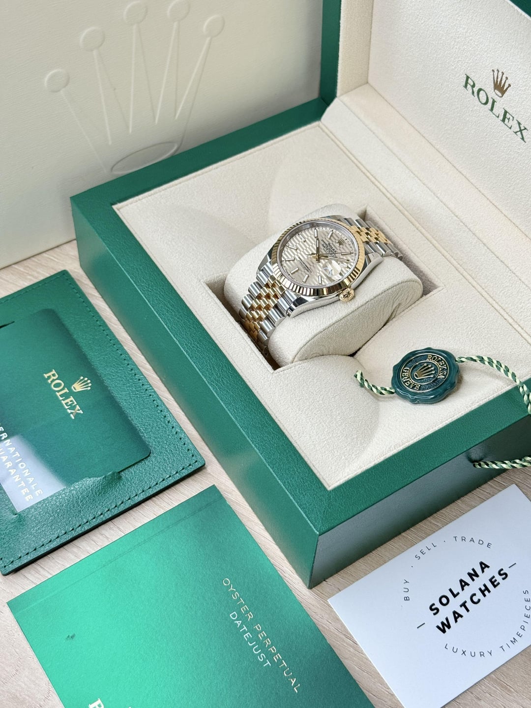 Selling this beautiful 36mm two-tone Rolex DateJust reference 126233 with the more desirable fluted bezel, jubilee bracelet, and motif dial. **It** **comes as a full set**, including the Rolex green box, outer box, booklet, warranty booklet, leather wallet, warranty card dated 2024, and the hangtag. **This DateJust is in excellent condition**. **Photos:** * [Album](https://imgur.com/a/dj36-motif-2024-may2025-MpMlPsg) * [Timestamp](https://i.imgur.com/Xxt6TKP.jpeg) * [More on my Instagram @SolanaWatches](http://find%20me%20on%20Instagram%20@SolanaWatches) **Price is $13,700** delivered in the CONUS. **I am a full-time watch dealer, and I have completed many transactions here.** I can provide additional references upon request. **Feel free to contact me** via PM here so we can exchange numbers and get on the phone or do a video call. You can also [find me on Instagram @SolanaWatches](https://www.instagram.com/solanawatches/). _Private showroom located in San Diego, CA. Reach out to schedule an appointment._ _All my watches are guaranteed 100% authentic, and I will stand by their authenticity._ _California buyers without a seller’s permit are subject to sales tax._