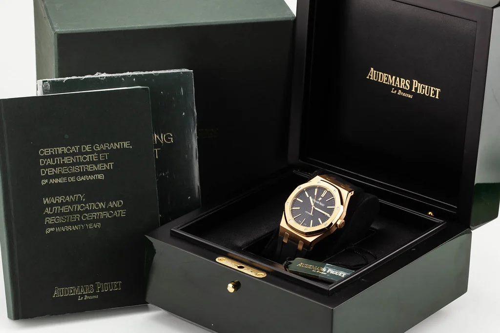 Up for sale is a near-mint condition Audemars Piguet Royal Oak Rose Gold Black Dial I Series, reference # 15400OR / 15400OR.OO.D002CR.01. It comes complete with all boxes, papers, booklets, hang tag, and AP Warranty Certificate dated October 2015.