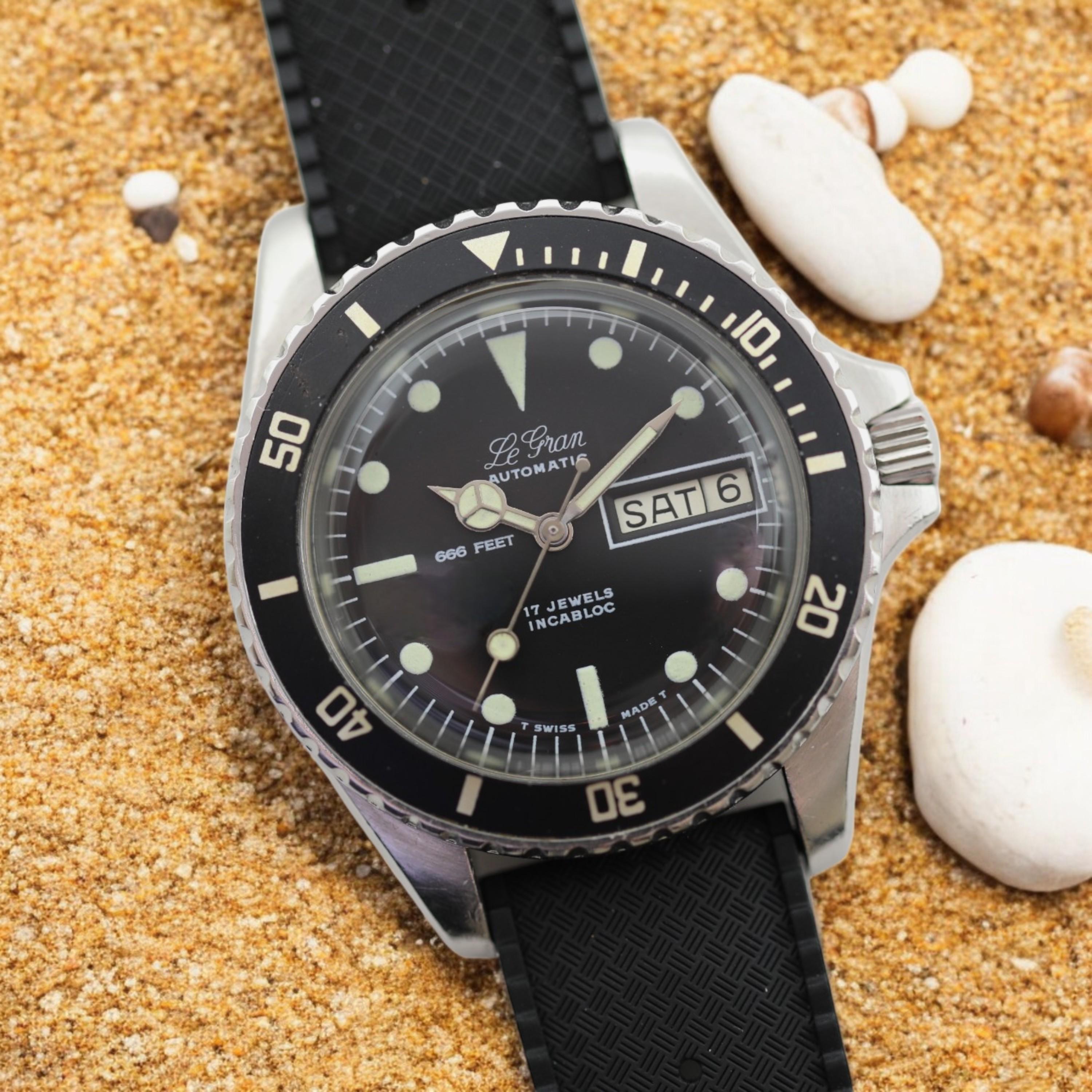 From what we understand LeGran (a victim of the quartz crisis) primarily acted as a distributor and had agreements with numerous suppliers in Switzerland. The Alsta Nautoscaph (watch from Jaws) LeGran sold under its own brand. Brand: Le Gran Model: Day-Date 'Devil diver' Case: 37mm Lug to lug: 45mm Strap: FKM tropic strap Box/papers: No Location: Los Angeles Price: $699 or make me an offer :) Web/IG: [keepiece.co](http://keepiece.co/) Pictures: [https://imgur.com/a/DQgSGni](https://imgur.com/a/DQgSGni) Timestamp: [https://imgur.com/a/UW9MVyJ](https://imgur.com/a/UW9MVyJ) CONDITION & SERVICING \-The dial is in excellent condition. \-The hands and lume plots have aged to a creamy off white color. \-The sides of the case show wear and have been lightly polished. \-Service history is unknown.