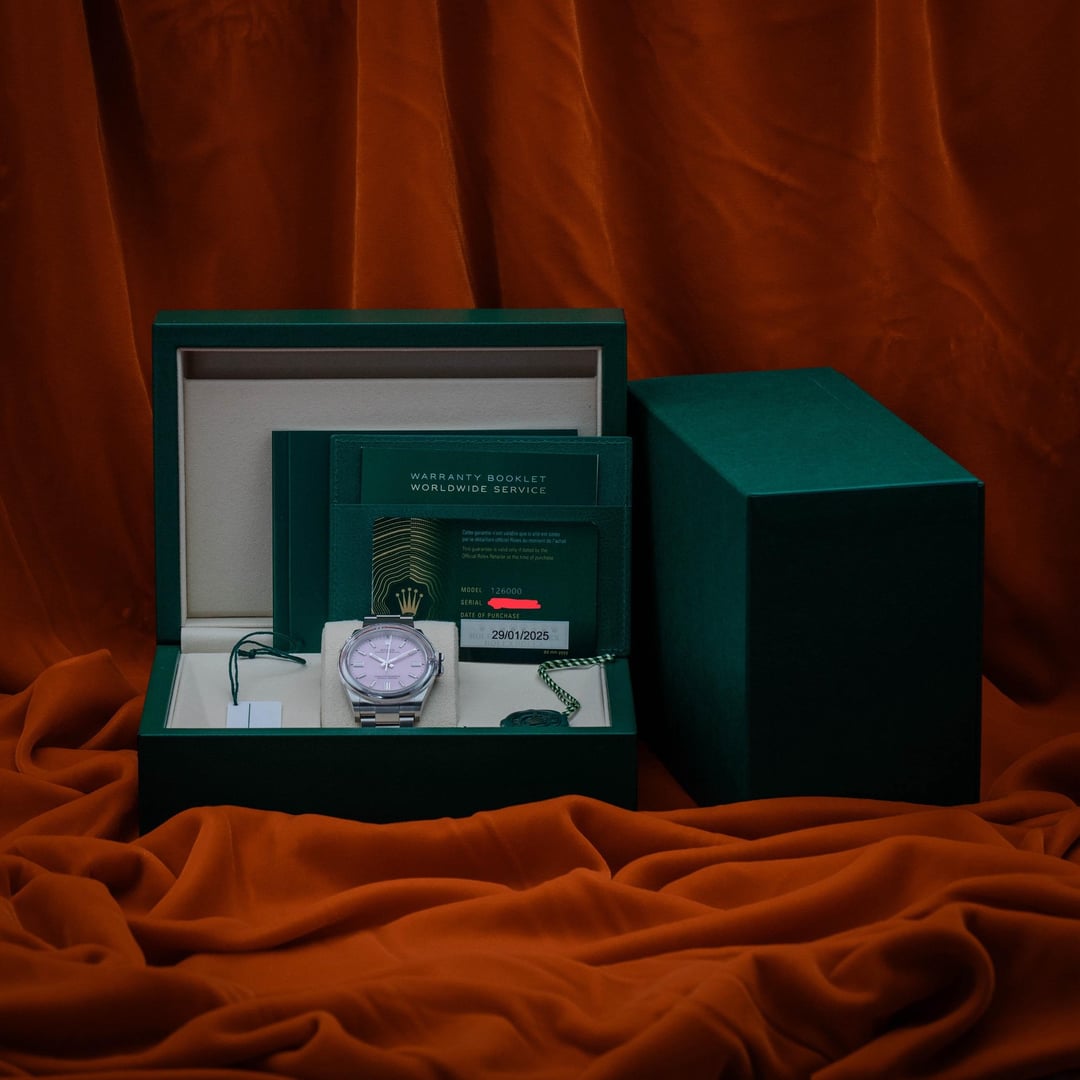 Ref: 126000 | 36mm | Stainless Steel Case & 💖 Candy Pink Dial | Full Set – Box, Booklets, Warranty, and Both Tags (Straight from AD) Up for grabs is the playful yet refined Rolex Oyster Perpetual 36mm Pink Dial, Ref. 126000 — one of the most coveted pieces from Rolex’s colorful dial lineup. A rare pop of bold color in a traditionally conservative brand, this one turns heads while maintaining the clean, classic OP silhouette. Crafted in corrosion-resistant Oystersteel, this 36mm case is paired with a striking pink sunray dial, Chromalight lumed baton markers, and finished off with the iconic Oyster bracelet. A vibrant everyday wearer with unmistakable Rolex DNA. Price: $11,885 • Payments accepted: Wire, Zelle, Credit Card (+3.3%) • Fully insured overnight shipping via FedEx. Condition and Details: 📸 This watch is in mint condition, sourced directly from an Authorized Dealer. It’s basically unworn and has only been handled for photographs. Comes complete with everything, inner and outer box, warranty card, booklet, and both tags. As always, macro photos are used to highlight the true condition. Any specks seen are from dust, not wear. Trades: ♻️ We accept trades across most luxury brands. Whether you’re trading up, down, or doing a multi-watch deal, let’s talk. We often work with brands like Rolex, Audemars Piguet, Patek Philippe, Omega, Cartier, Tudor, and others. Cash can be added on either end to balance the deal. Shipping and Viewing: 🚚 Overnight, fully insured shipping to your nearest FedEx location (Hold for Pickup). Happy to hop on a FaceTime or phone call to show you the piece and answer any questions you may have. Customer Satisfaction Guaranteed: 💯 Every watch we list is guaranteed authentic and exactly as described. With hundreds of successful transactions, g00gle reviews, and verified references, we pride ourselves on providing a smooth, professional experience with every deal. Connect: 🤝 Contact info: https://kaiposcollection.shop Timestamp -> https://imgur.com/a/ZRQm45y
