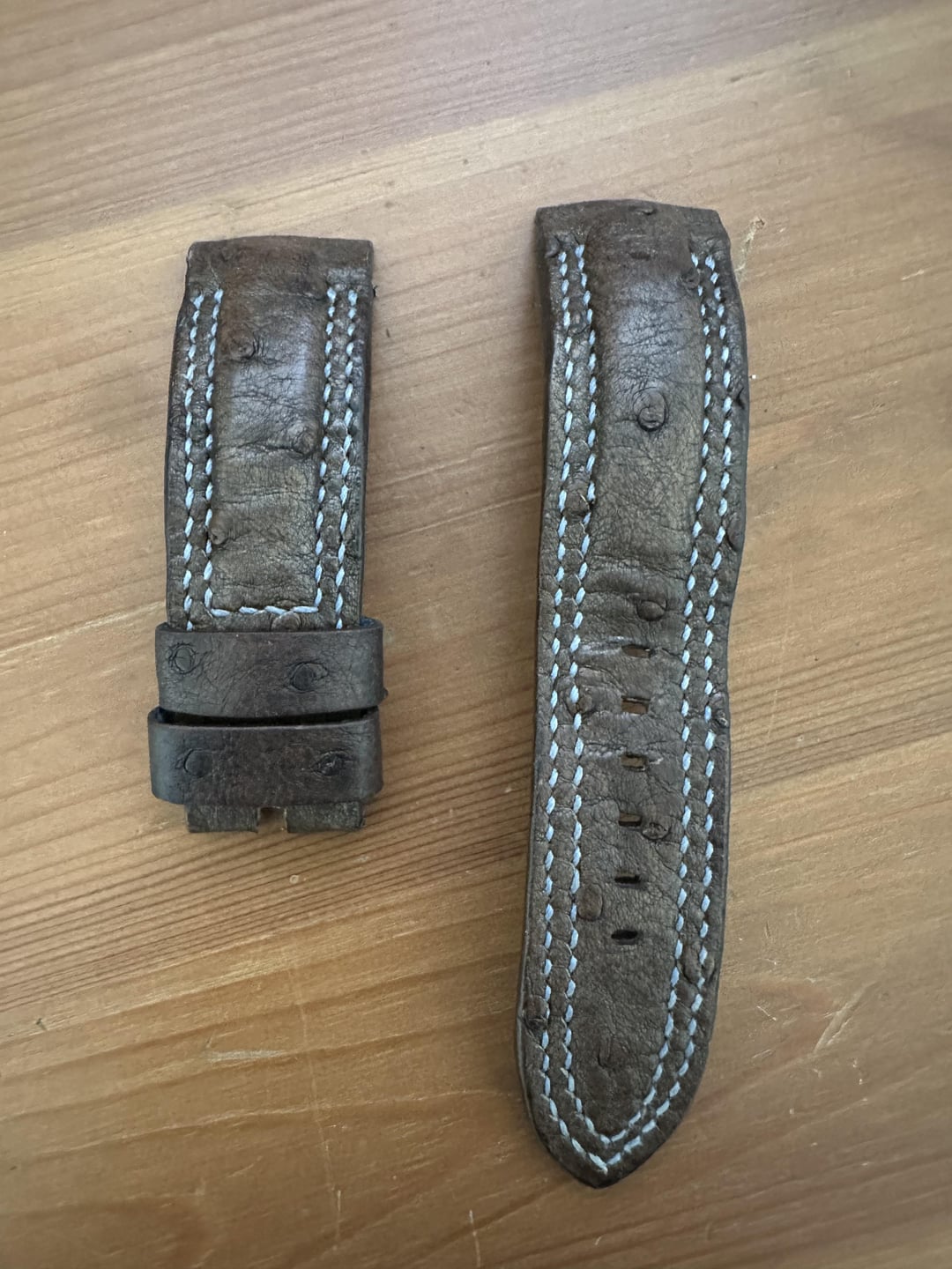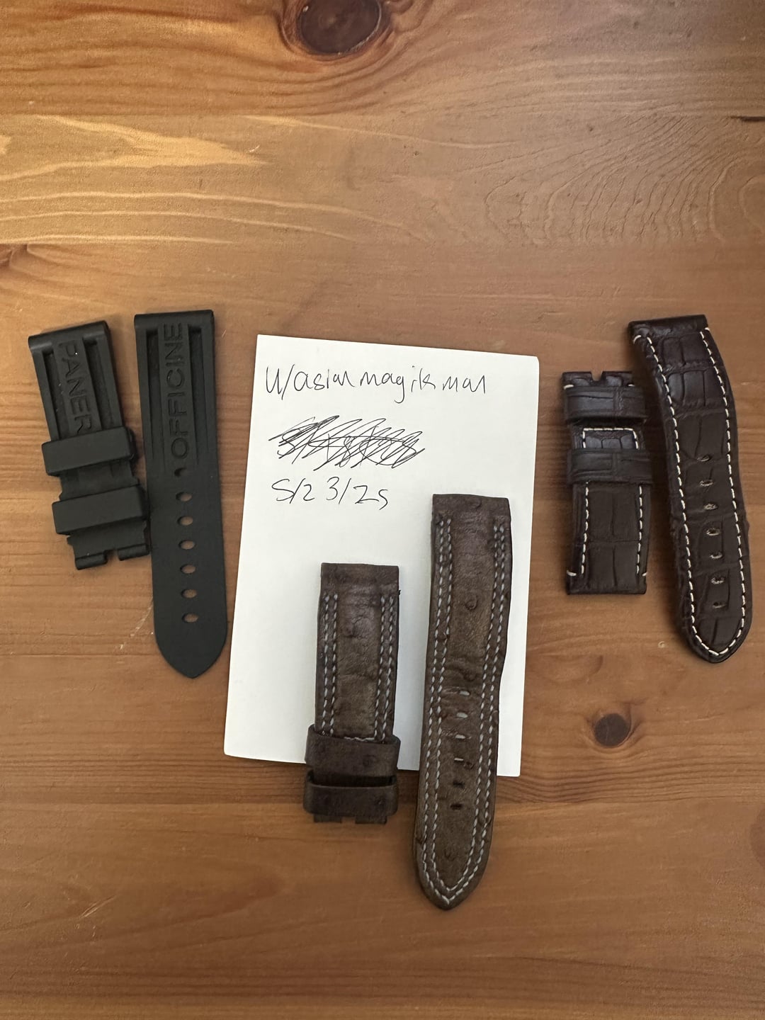 Hi all, Looking to sell 3 watch strap. All three are 24mm straps that tapers down to 22mm. Great choice for any panerai lovers out there! Strap 1 - Black rubber Panerai: $40 Strap 2 - Dark brown leather: $40 Strap 3 - Brown Ostrich leather: $60 All straps will be sold as shown. If you have any questions let me know!