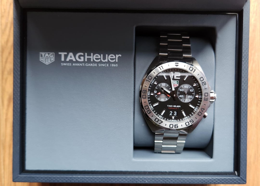 Ref WAZ111A.BA0875 Case - 41mm Thickness - 12.1mm Fixed bezel Grand date at 6 o'clock Lightly worn with the usual desk diving marks, no deep scuffs or gouges. Fresh battery replaced two weeks ago and running perfectly. The best looking of the current F1 range IMO, very clean and symmetrical with great proportions and finishing. Comes with all spare links, box and paperwork. $650 shipped to the USA via PayPal FF, I'm newer here but have plenty of sales on u/gunaccessoriesforsale and eBay, can provde the latter reference if needed. Thanks for looking!
