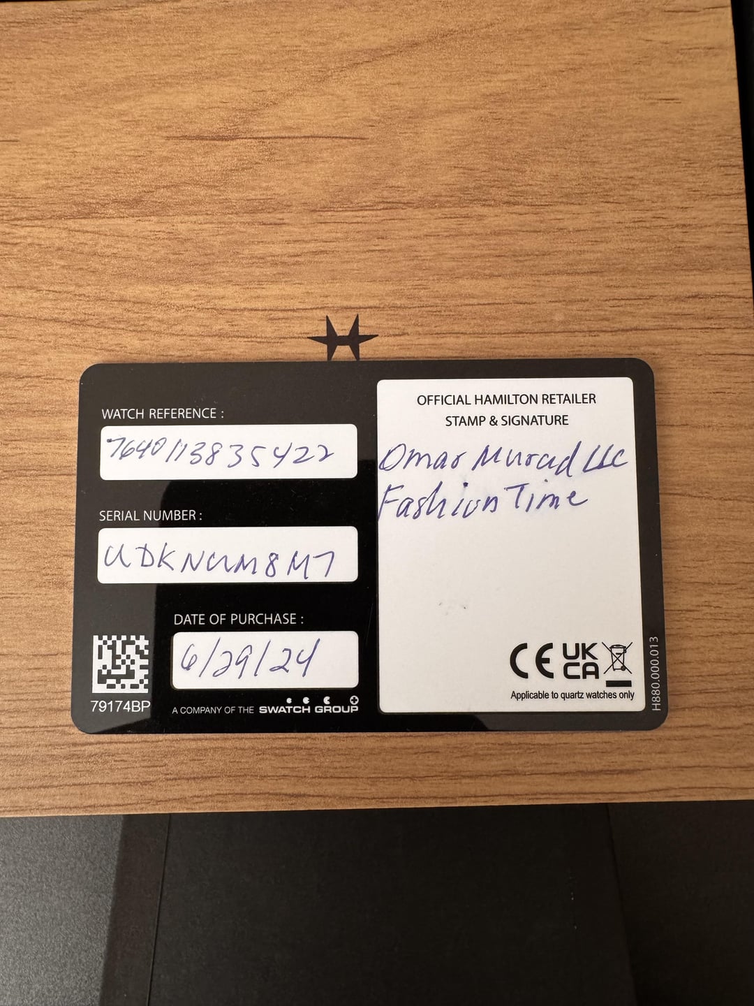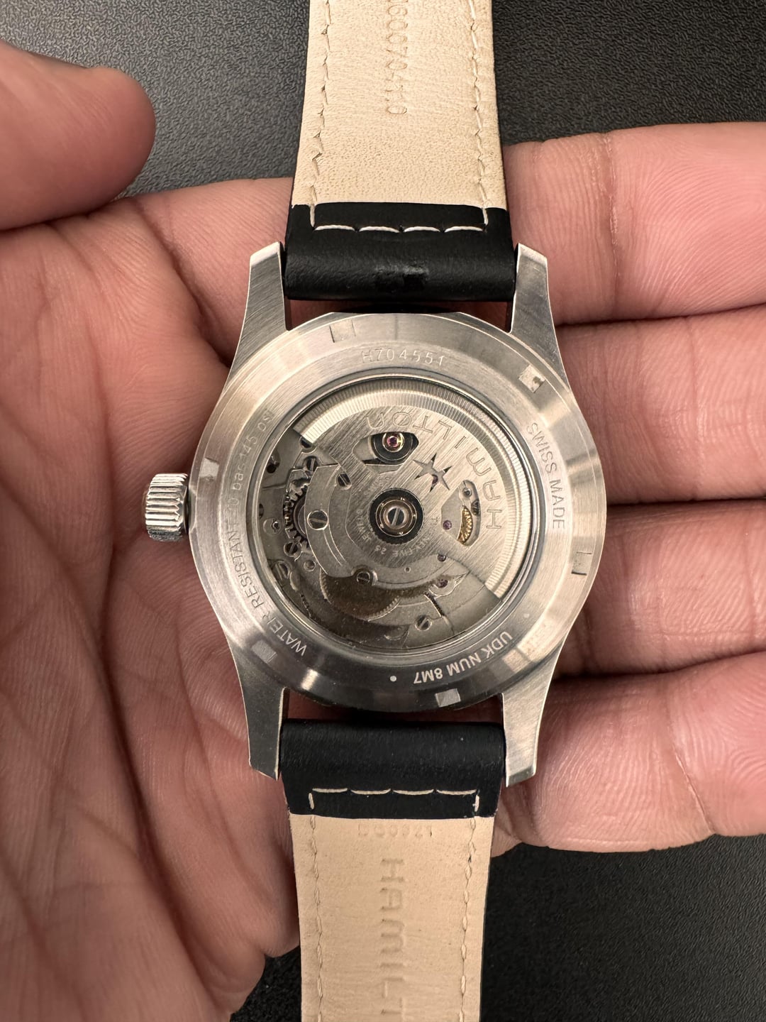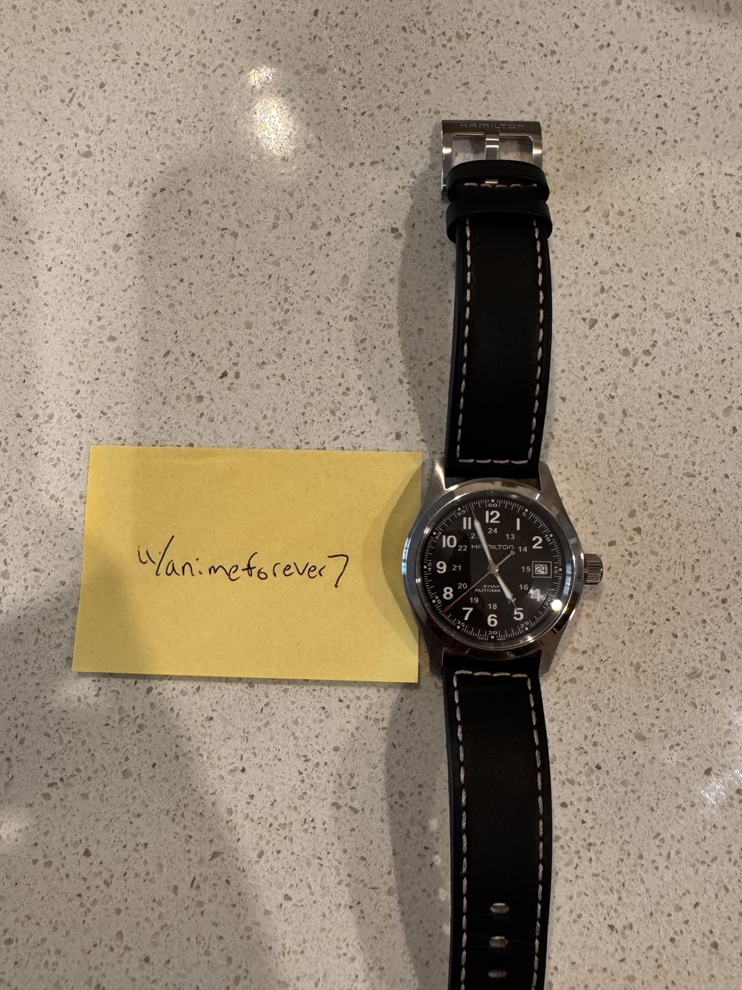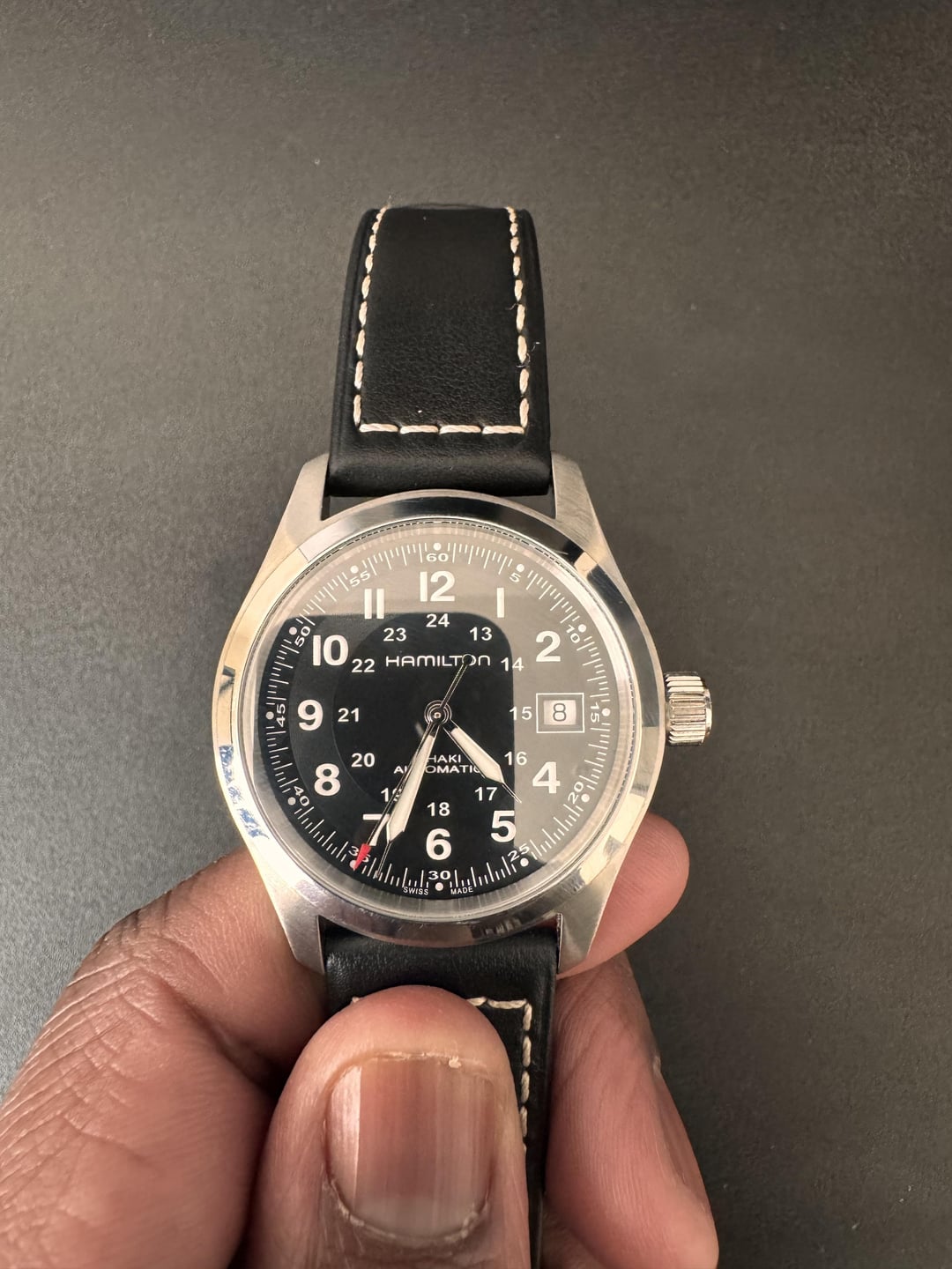 Hi all, I’m looking to sell my Hamilton Khaki Field Automatic (42mm) – Reference Number H704551. Details: • Condition: “Great condition, worn sparingly” • Movement: Automatic (H-10 with 80-hour power reserve) • Case size: 42mm • Case material: Stainless Steel • Crystal: Sapphire • Strap: “Original leather strap” • Box “Comes with original box and manual, and warranty card” Price: $450 Feel free to message me with any questions.