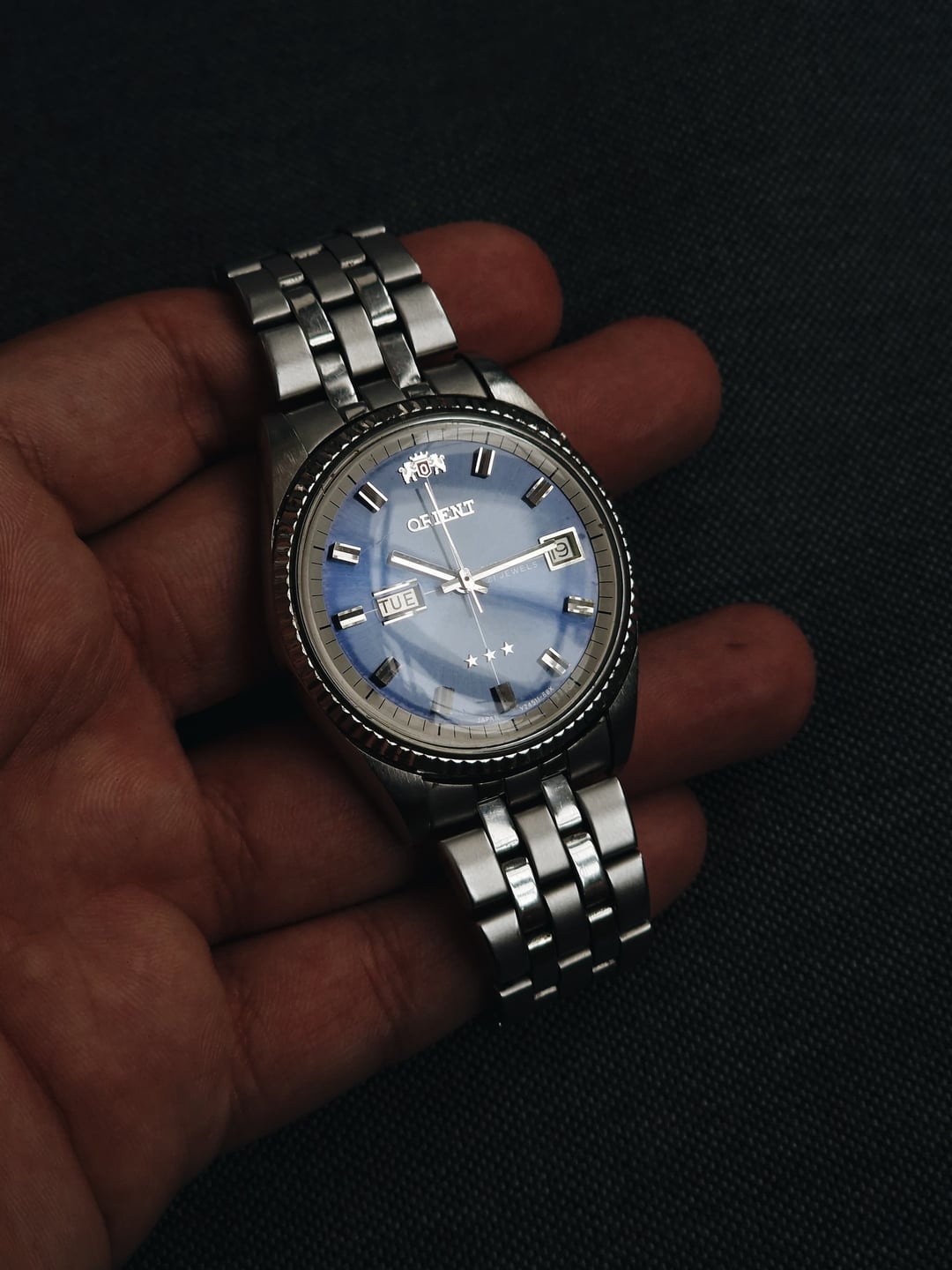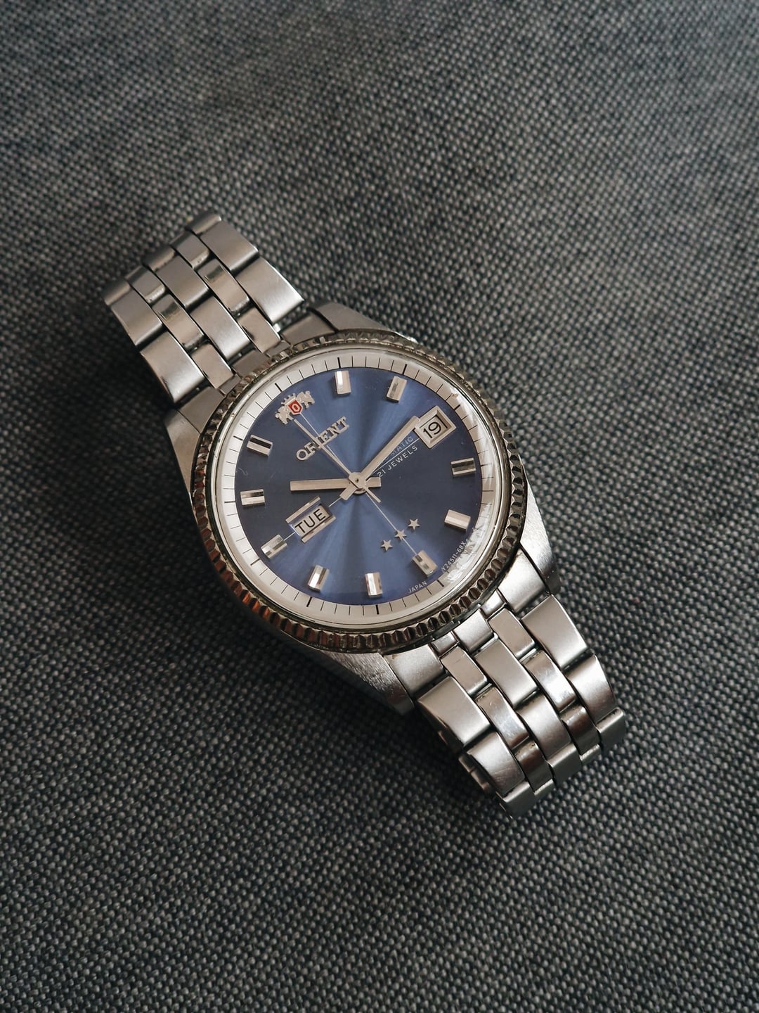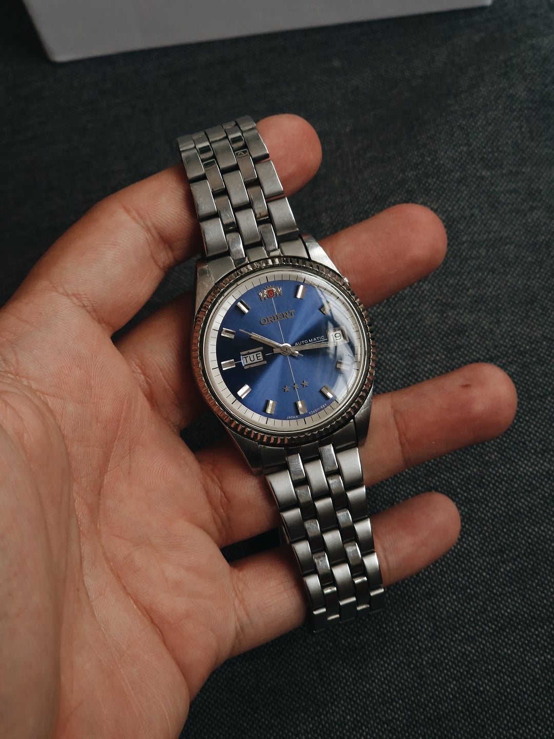 This is easily one of the coolest vintage Orients on the market right now – a gorgeous blue sunburst dial, a rather large case size of 37.5mm with a fluted bezel, and of course, the original jubilee-style bracelet. Not bad for a watch that’s over 50 years old! The day-date configuration also makes it a very interesting piece. Plus, it’s powered by the caliber 1942, a workhorse movement introduced by Orient in the 60s. From what I’ve seen, reference 904511 is incredibly difficult to find in this condition and with this dial.  **Condition:** Impressive condition for its age. No major scratches or scuffs. pictures for a better description. **Case Size:** 37.5 x 45.5 mm stainless steel case with a thickness of 12.9mm and a lug width of 20mm.  **Movement:** Orient 1942, automatic with 21 jewels and a beat rate of 21,600 bph and quickset date. I don’t know its service history, but everything is working as it should.  **Price:** Asking $215. Please add $20 for worldwide shipping. Payment methods include Wise, ACH transfer, Revolut, Bitcoin (On-Chain or Lightning), or PayPal G&S for buyers with solid references. Add +6% for currency conversion fees on the latter. I’m located in Portugal, but worldwide shipping isn’t an issue.  Established seller with over 220 transactions – buy with confidence! Make sure to follow me on Instagram (@daily.worn) to check out the newest additions. [Pictures](https://imgur.com/a/x6wTv73) [Timestamp](https://imgur.com/a/CjtZXbp)