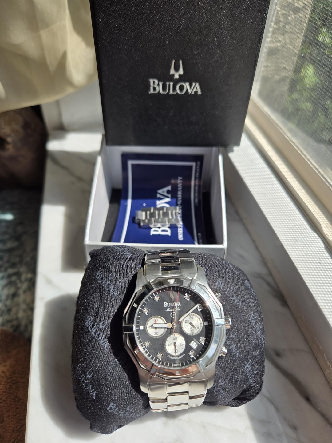 Up for sale is my **Bulova Marine Star 96D16**, a bold yet elegant stainless steel quartz watch that blends sportiness with refined detailing — including **8 genuine diamond hour markers**. This one is in **excellent, unworn condition**, with the **original factory sticker still on the caseback**, and includes the **original box, papers, and extra links**. # 🕰️ Specs: * **Case Diameter**: 40mm * **Lug-to-Lug**: \~47mm * **Thickness**: 11mm * **Lug Width**: 20mm * **Crystal**: Mineral (1 faint hairline visible under certain angles) * **Movement**: Miyota Quartz *(battery currently not running, likely never had one)* * **Dial**: Black sunburst with 8 **genuine diamond hour markers** * **Case/Bracelet**: Brushed & polished stainless steel * **Water Resistance**: 100M # 📦 Included: * Original Bulova **box and papers** * Sized to \~6.5" wrist * **3 extra links included** * **Factory sticker still intact on caseback** # 🧼 Condition: * **Unworn**, only placed on wrist briefly for **sizing and listing photos** * Light handling marks from storage * One **faint hairline scratch** on the crystal * **Battery is not currently running** – likely never installed from factory.*I've chosen to leave the sticker in place and the case unopened to preserve its fresh, near-NOS condition. Buyer can install a new battery if desired.* # 💰 Price: $145 USD shipped (OBO) – CONUS (International for additional shipping) Payment via **Zelle or Paypal f&f or G&S (+4.4% paid by buyer)** for buyer protection Feel free to DM with questions or for more photos. Thanks for looking!