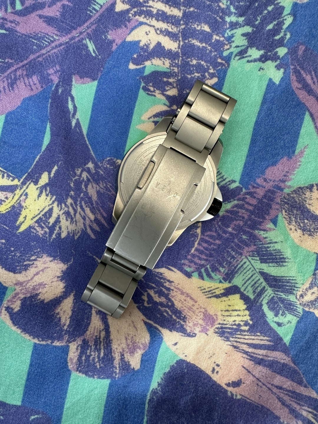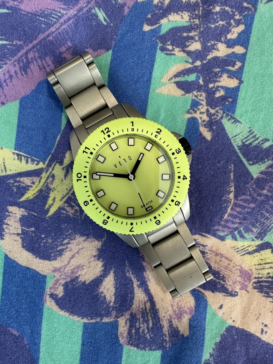 Hi all! Up for sale is my Vero Open Water in the wild and fun "swell" colorway - ready for summer! Comes with inner and outer box, extra links (currently sized for my \~7" wrist). Purchased directly from Vero, and warranty is transferrable to new owner - just need to send them a message when you receive it. Condition is good with some minor wear on clasp and bracelet. Price is $500 shipped from South Florida to the US, preferably via Zelle. Open to other payment methods - let's chat first. [Timestamp](https://imgur.com/undefined)
