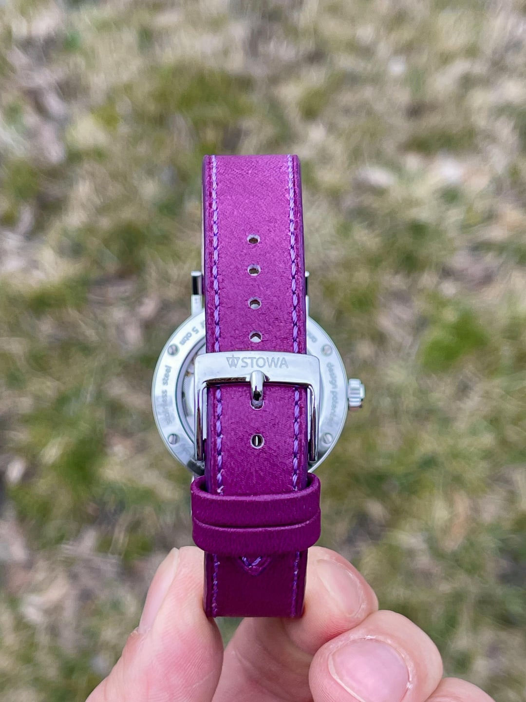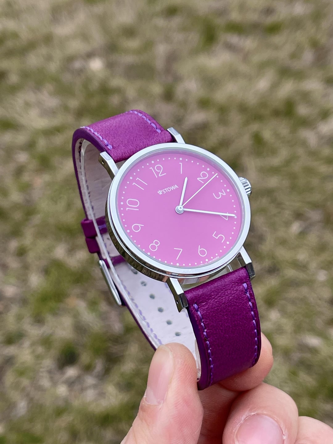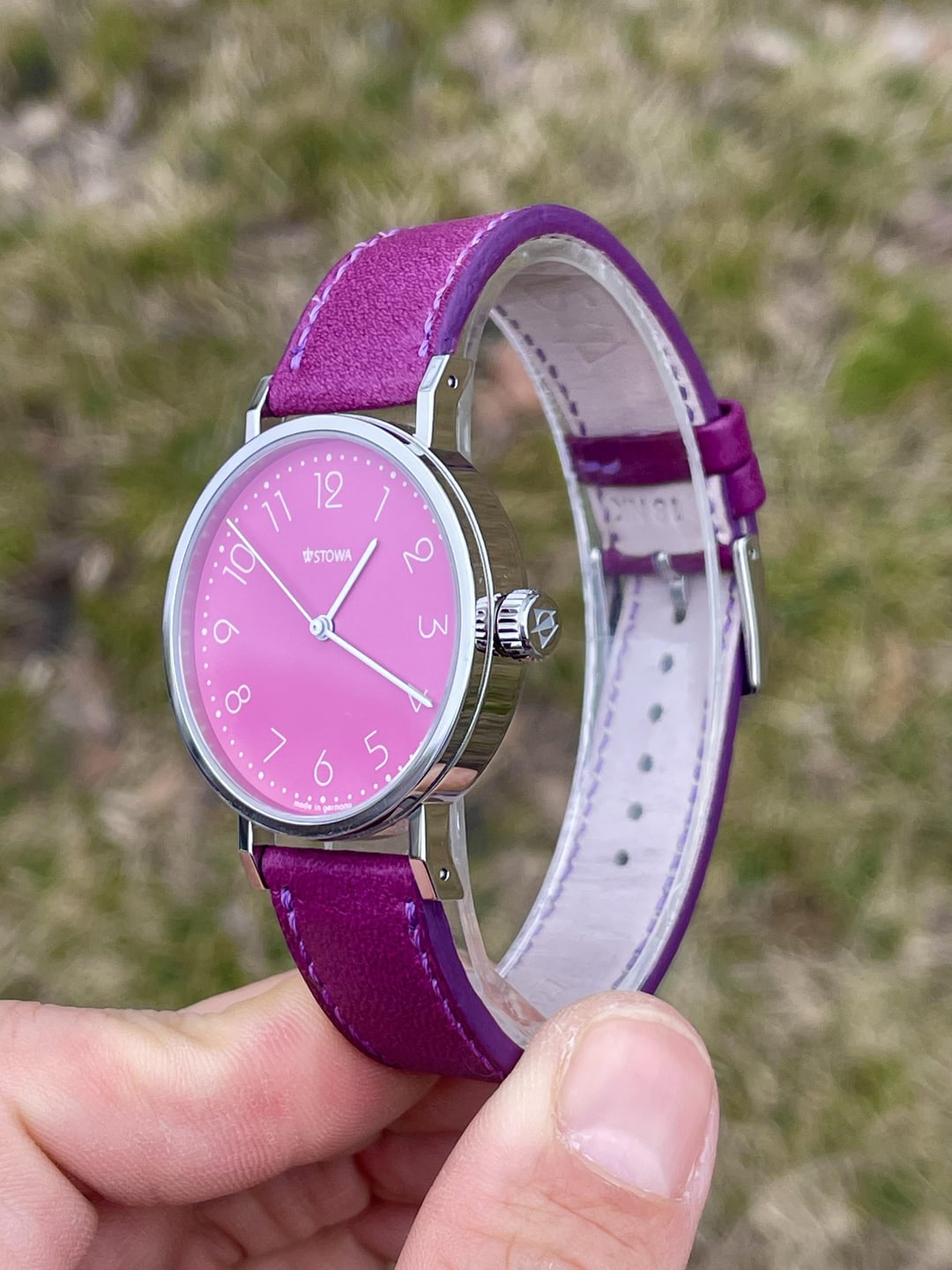 Hi all! Here is for sale a beautiful Stowa Antea b2b 365 from their Back to Bauhaus collection. For sale is the watch only. The case is stainless steel and measures 36.5mm, case is in great condition, it has signs of wear but no major dings or deep scratches. Caseback has sapphire crystal, steel outer ring has all the necessary inscriptions. Crown is authentic signed Stowa. Crystal is sapphire, has no blemishes. Dial has Stowa logo, it has beautiful pink color and white arabic numerals and white handset. Dial has Made in Germany at the bottom. The movement is automatic ETA-2824 which runs +7 sec/day, it is nicely decorated for Stowa. Strap is authentic purple leather Stowa with Stowa buckle in great shape and looks merely worn. Watch looks gorgeous due to its minimalistic design and nice pink dial paired with cool purple leather strap. Detailed pics/videos: https://imgur.com/a/J73t0wd Timestamp: https://i.imgur.com/i4wDuNA.jpeg Price $415 through PayPal Friends and Family, Standard International Shipping is included in price. I ship worldwide. I’ve sold a couple of watches here, so please check my feedback on r/WatchExchangeFeedback Not interested in trades