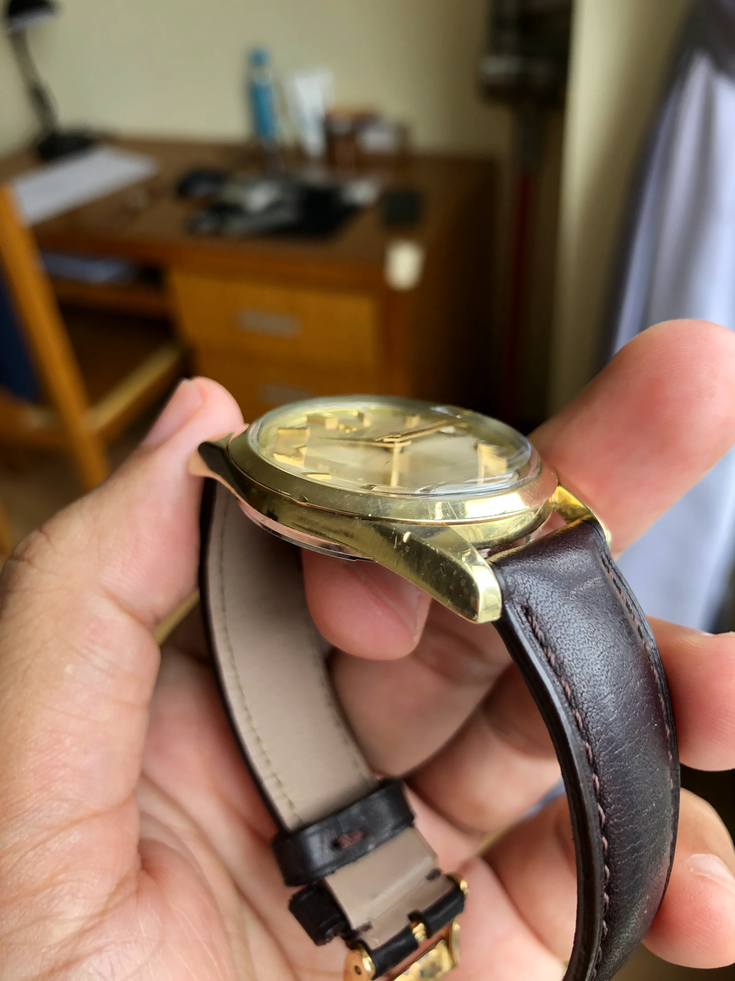 - Strap/buckle: Brown leather strap with smart spring bars. Original MG Omega plaque G buckle in fair condition with clear signs of wear.