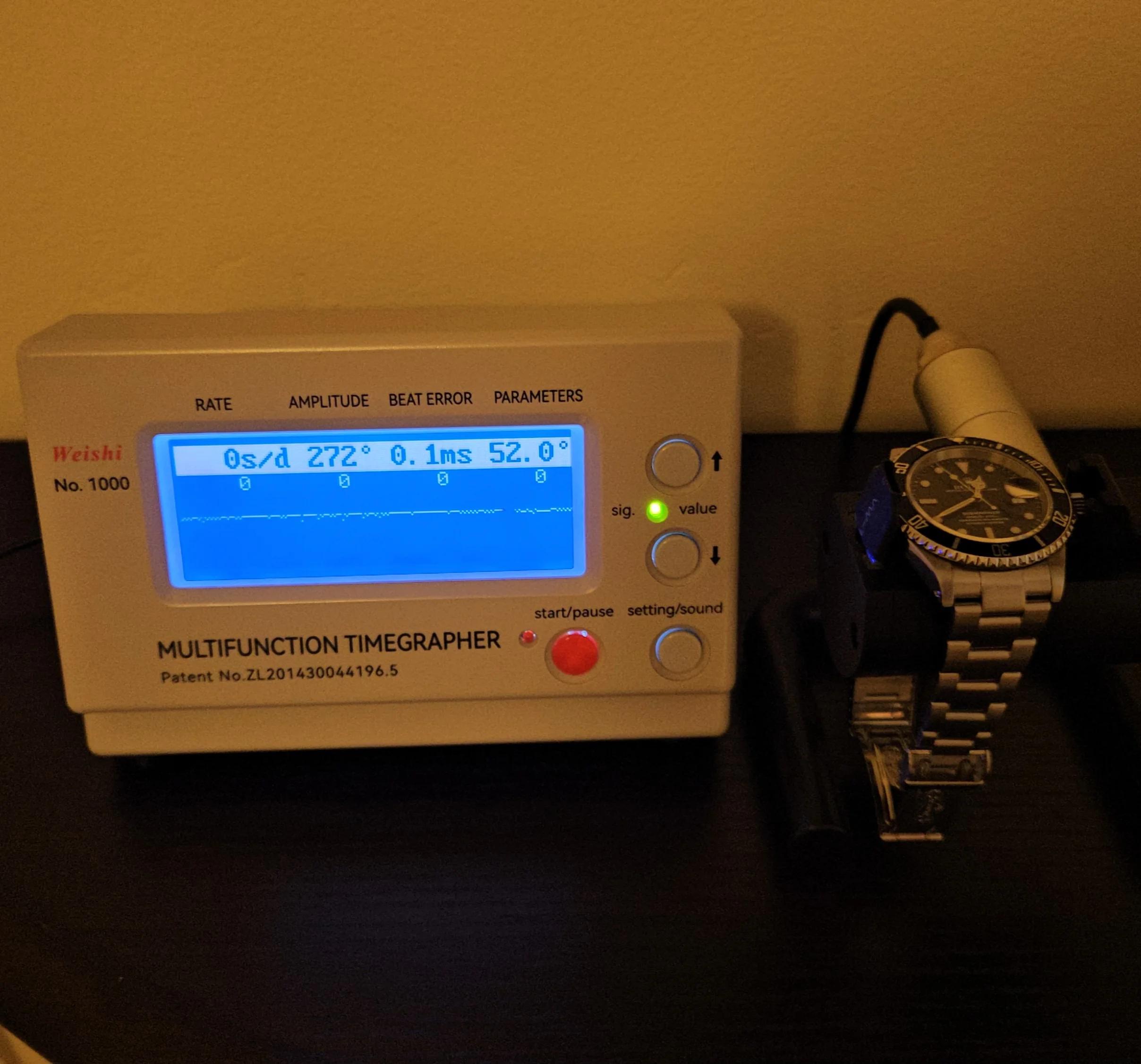 Mechanical Condition: Serviced at RSC in May 2022; the movement appears to be running very well. Daily accuracy shows 0 sec/day and strong amplitude (272 degrees), in the dial up position. Timegrapher picture is included for reference.