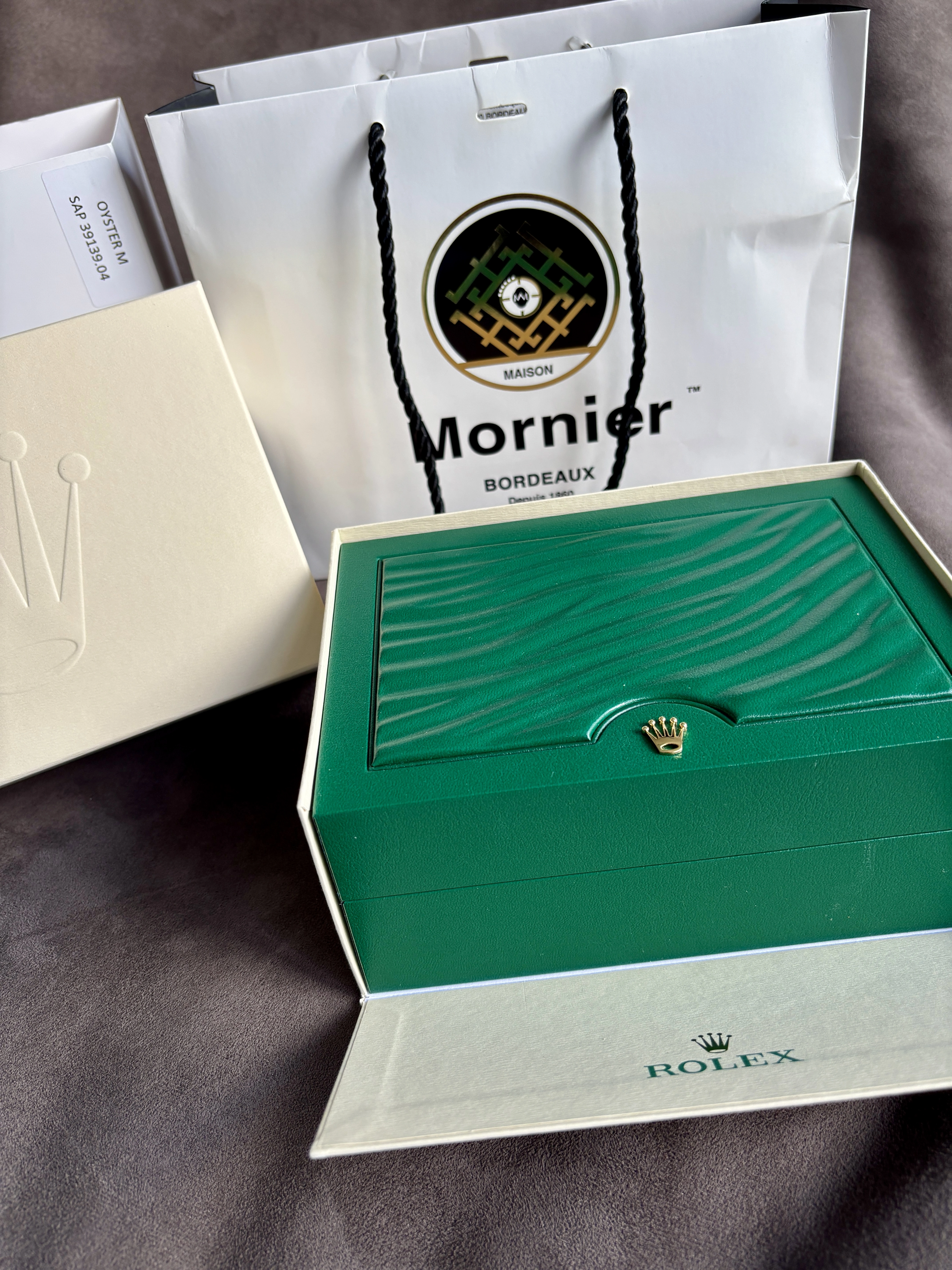 It's a true full set: original invoice, box, outer box, activated warranty card, watch booklet, warranty booklet, additional links, tag, and even the jewelry bag.