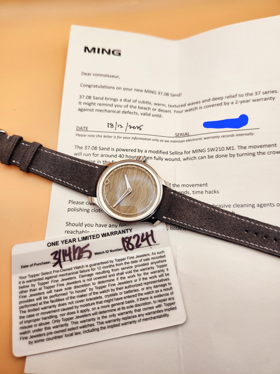for sale or trade today is my Ming 37.08 Sand one of 500, full set in excellent condition with only minor hairline scratches and scuffs, purchased from toppers a few months ago so still under their 1 year warranty as well as ming's until the end of the year, i would rate the watch a 9/10 in terms of condition and toppers rated it a 90%, same for the oem strap which also has some minor creases. watch comes with 2x MTO unused custom curved straps from Artisan Straps in Australia valued at over $200 usd, 1x Taupe Buttero strap and 1x Light Grey Suede, both 105/70mm in length. Looking for $3450 shipped conus via zelle only willing to trade up for a Zenith Chronomaster shadow, a Omega Railmaster 1957 Trilogy, or a Grand Seiko SLGW003