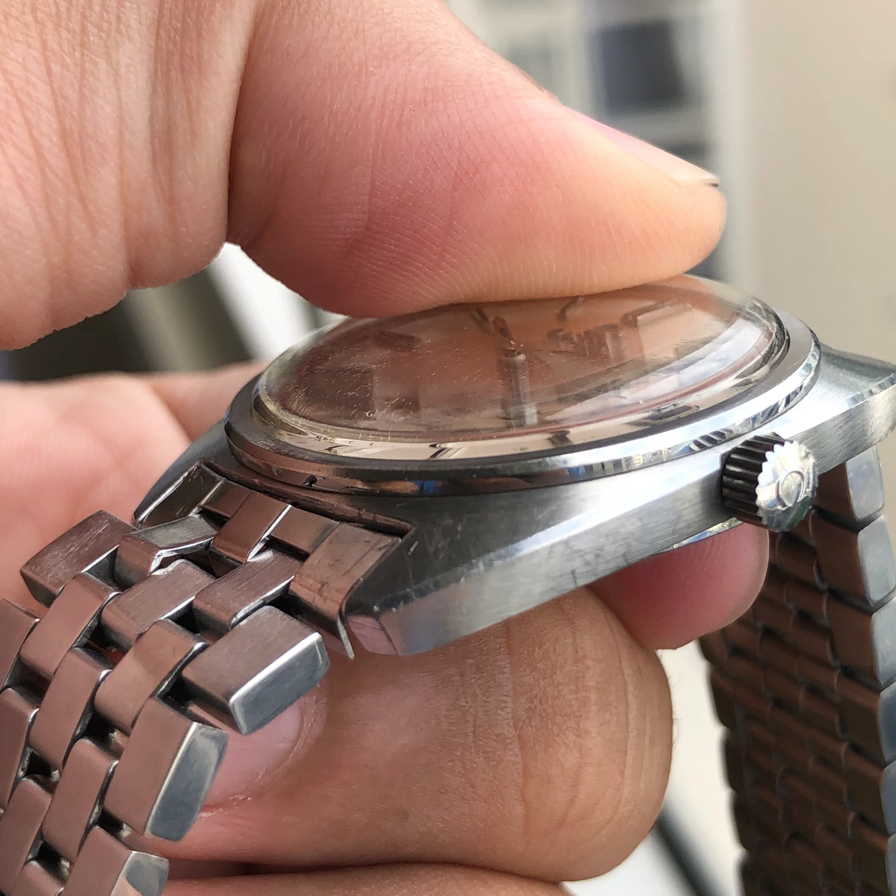 - Dial: Original white sunburst dial with onyx overlayed hour markers in very good condition; lume on hands and hour markers (lume partially lost at 3,4); faceted date-aperture frame at 3; baton hands; prints, hands and hour markers are all good.