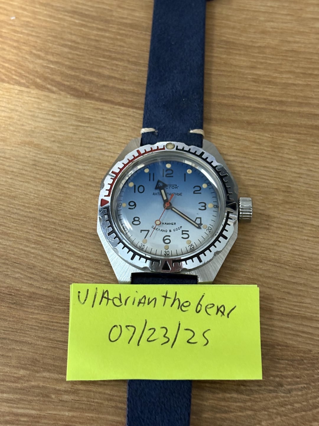 Hi WatchEx, Up for sale is a vintage manual-wind Soviet Union era Vostok. The dial features a cool blue gradient style dial, paired with a brand new strap. Watch is priced to sell at $95 with shipping included within CONUS. Watch Overview • Brand: Vostok (Boctok in Cyrillic) • Model: Amphibia • Country of Origin: USSR (СДЕЛАНО В СССР = “Made in USSR”) • Era: Likely 1980s–early 1990s 🔧 Technical Specs • Movement: Vostok 2416B (Automatic) • 31-hour power reserve • 19,800 bph • Non-hacking, hand-winding capable • Jewels: 17 • Case Size: ~39mm • Lug Width: 18mm Condition + disclaimer: This watch runs and keeps time. The crown has some play in it but otherwise functions as it should and the watch winds as it should. All sales are final. Price: $95 w/ shipping included within CONUS. Payment: Zelle or PPFF