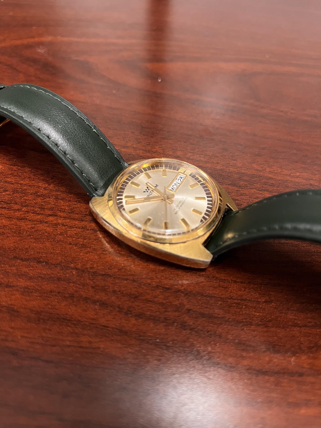 About The Watch This is a fantastic 1970s era vintage Waltham automatic watch with 17 jewels. The new green leather band goes very well with the gold bezel, dial, and case. The case itself is approx. 35 mm measuring by sight from experience. I unfortunately do not have a caliper to confirm. I do have a video if you would like to see it on a wrist. As far as I am aware, I am the second owner. It has been serviced within the past few months and is keeping time very well. The crystal and case show minimal wear for the watch’s age. The serial number for the watch, as stated, is CT800-1663. I will be shipping from the US - ideally domestic buyers only but I can also make international work. I am happy to negotiate on price and please let me know if you have any questions!