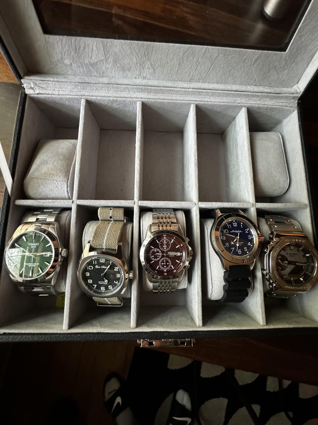 Excluding the GShock. Pictures is my Green Dial Tissot Gentleman Powermatic 80 (can come with a brown leather strap), I have the box. Recently polished with cape cod cloths. San Martin original design automatic watch (forgot the model but can tell you. It’s on a NATO now but the bracelet on the Seiko is from the San Martin, would give it to you with that). I have the box. The Seiko chronograph is a JDM model quartz from Japan. I have its original bracelet on standby. Box too. The Vostok Amphibia is well, a Vostok Amphibia. I think I have the box nearby. Obviously I’d disinfect them all with rubbing alcohol before sending out, forgive the finger prints. Willing to trade off up to all of them for something. Will send more pictures and angles once a conversation is started.