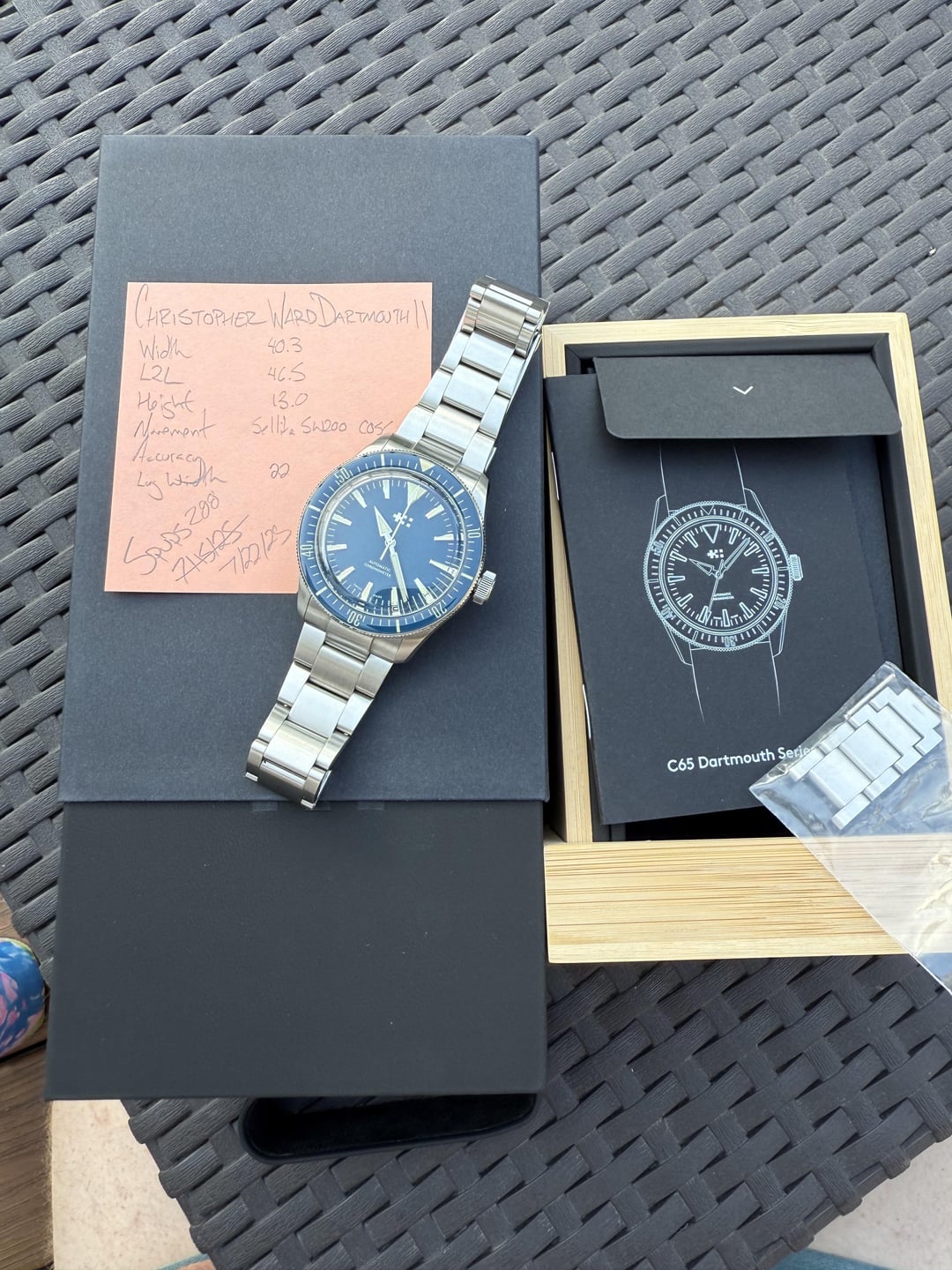Christopher Ward Dartmouth Series 2 Blue $950 firm - full set with Bader Bracelet with micro adjustable ratchet clasp and quick release. The Dartmouth borrows inspiration from Omega Seamaster 300 (Big Triangle) but modernizes it with the Light-Catcher Case, full superluminova dial and lumed sapphire bezel, and Sellita SW200-1 COSC Chronometer spec movement. Width 40.3 w/o crown L2L 46.5 Height w/ crystal 13 Lug Width 22 Exceptional quality at this price range, but it’s just a bit too large for me. Full lume dial is fun and works a lot better than I expected (I.e. it’s not just a gimmick). This is on back order til October and retails for $1295. Chris Ward has been including new tariff pricing for a few months, so full retail is closer to $1600. I’m asking a reasonable $950, with 4 years plus warranty still remaining. Price includes signature shipping to the US. I’m experienced shipping outside the US and I’m open to doing so, but please be prepared with references of your own. I prefer PayPal goods and services. I think the prices are competitive. If you’d like a deal, and feel comfortable with PayPal f&f, I’m open to negotiate slightly.