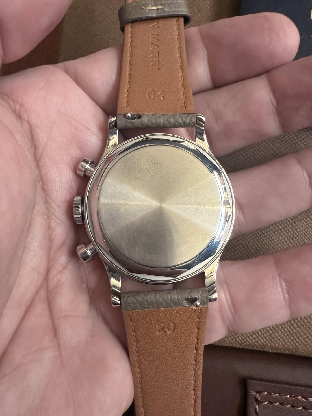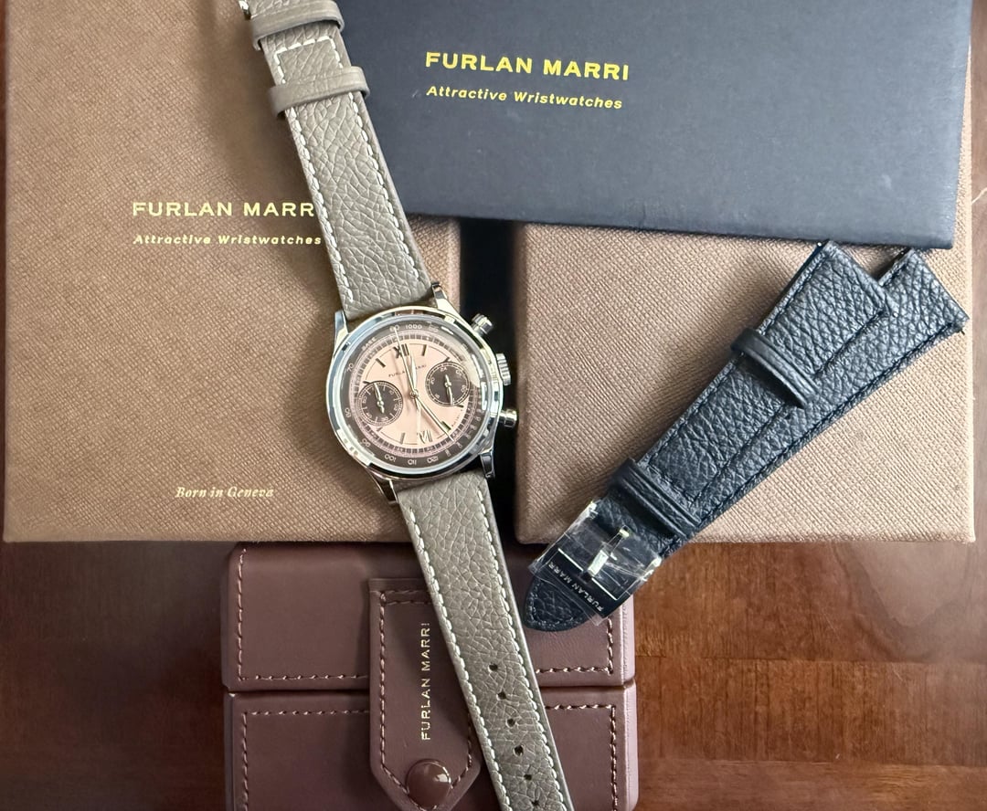 Selling my Furlan Marri Havana Salmon - full set box & papers INCLUDED: Both inner and outer boxes Two straps (taupe and black) Papers Watch itself SPECIFICATIONS: Material : 316L stainless steel. Diameter : 38 mm diameter case. Thickness : 11.5 mm. Lugs: 46mm lug to lug. Finishes : Perlage, mirror polish, satin-brush, engraving and deep-embossing. Glass : Scratch-resistant double doomed sapphire crystal with five layers of anti-reflective coating and one fingerpr resistant coating. 5 ATM Near Mint condition. Gently worn only a few times. Looks and functions like new. Specifications: Functions Chronograph with tachymeter scale base 1000 / 24 hours indications CONUS $1100 shipped