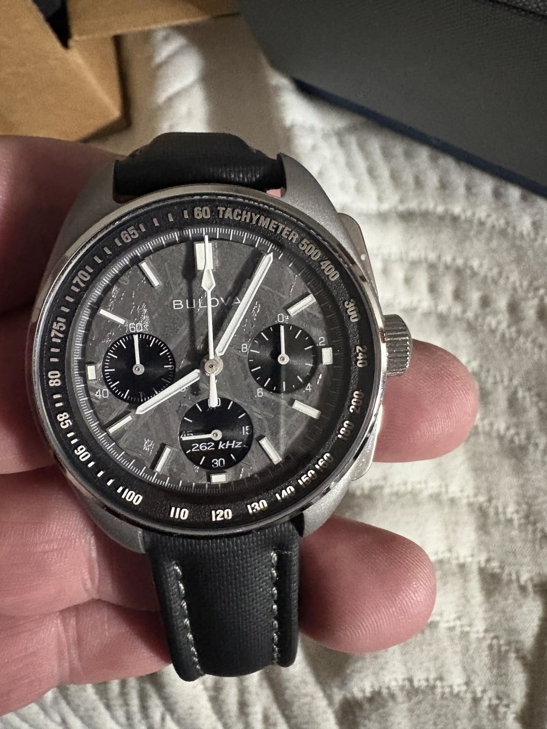 I'm offering my Bulova Lunar Pilot with meteorite dial for sale. The watch comes complete with unworn leather strap. This version of the Lunar Pilot comes with the following: - Grade 5 titanium case - meteorite dial - stainless steel pushers and crowns - The HPQ NP20, A movement featuring a 3-pronged quartz crystal with a frequency of 262 kHz that is 8 times greater than standard quartz, leading to an accuracy of seconds a year. The 43.5 wears great on most wrists due to a reasonable lug to lug of less than 50mm and 20mm lug width. For the money you’re getting a ton of watch here with some history. The only other watch that's been worn on the moon. No trades. Reasonable offers considered. Thanks for looking.
