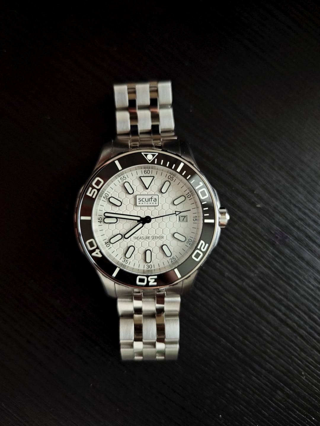 Hello all and welcome to my sale post! Up for sale is a cool watch from Scurfa. This is the Treasure Seeker with a white dial, and it features a Miyota 9015 automatic movement, which is reliable and accurate for the price. This watch is in near mint condition. There are some light scratches from handling and wear, but no major dings or gouges. The watch will come with box and warranty card. -Reference: TS-WHITE -Size: 41mm -Movement: Miyota 9015 automatic -Strap: Original bracelet -Watch with box and warranty card Price here at $375 shipped anywhere in the continental U.S. No trades sorry! I take Zelle (preferred), or bank wire as payment. Paypal F&F/Venmo can be an alternative if you have feedbacks on this subreddit. I have 100+ confirmed transactions on watchexchange, and many more on other platforms. Buy with confidence!
