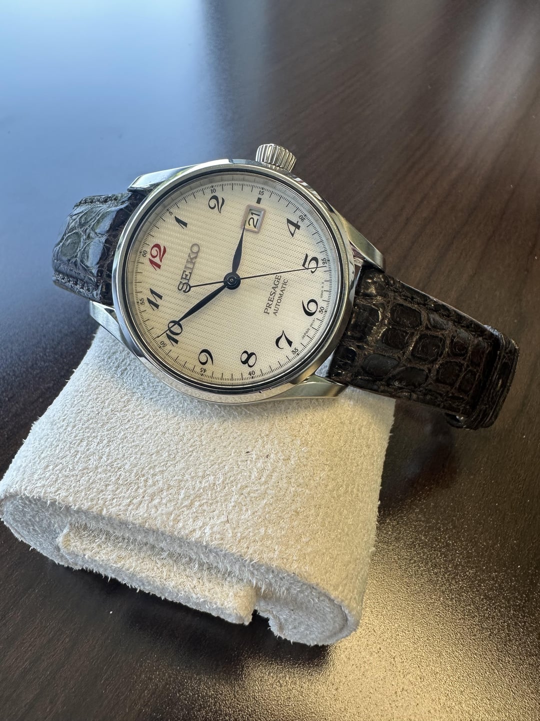 SPB067J- Seiko Presage Laurel. Good overall condition, herringbone patterned dial is beautiful. Leather strap and clasp in very good condition. Asking $350 SARX029- Seiko Urishi black lacquer dial watch. Gorgeous dial with gold hands. Good overall condition. Strap and clasp in good condition with lots of life left. Asking $550 or best offer SPB117- Sharktooth Alpinist, black dial. This watch has been worn daily. No deep scratches or dings, just surface wear. Still a great GADA watch that could look new again with a simple refinish if desired. Fits my 6.8” wrist with 1 more micro adjust available. Asking $325 or best offer. If you want more than one, make me an offer!