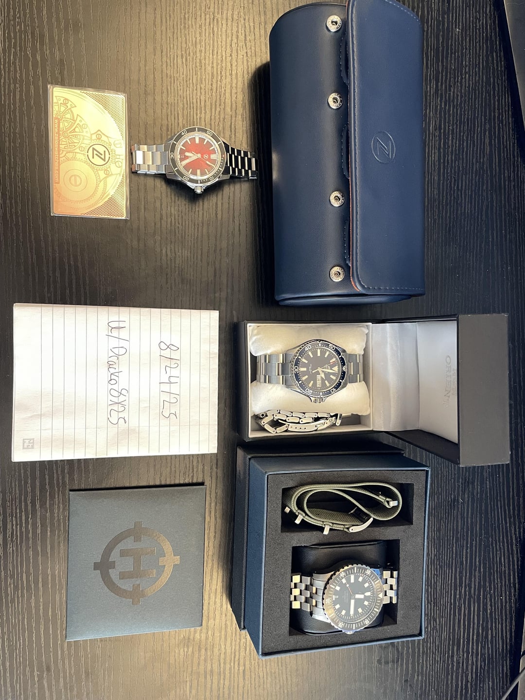Hello! Looking to slim down my collection and want to move on from some pieces that aren’t getting as much wear. More details on the watches and pricing below, happy to provide additional pictures or answer any questions as needed. Zelos Swordfish Red (40mm): Watch, box and papers. The watch is under warranty through October 2025. I am the original owners and purchased the watch directly from Zelos. The Swordfish is a great piece and has high quality construction for the price. I’m a huge fan of the bezel action and easy adjustable clasp that comes with the model. The watch has some very minor marks on the bracelet and clasp, but is generally in great condition. Asking $450. Orient Kamasu Blue: Watch and box, plus upgraded oyster style bracelet and clasp from Strapcode (original bracelet and clasp included as well). I am the original owner, with the watch being purchased from Jomashop. The Kamasu punches far above it’s weight and feels much sturdier / robust with the upgraded bracelet and clasp, just doesn’t get as much wear compared to some of my other divers. Watch has some minor marks on the clasp and bracelet, but otherwise looks great and runs well. Asking $225. Helm Vanuatu (Titanium): Watch, box and papers. I am the second owner (purchased off of Watchexchange). Fantastic watch, extremely robust and has great presence on the wrist. The titanium construction helps with making the Vanuatu very wearable. The watch has been worn and has some desk diving marks on the bracelet and clasp. Great piece and gives you the opportunity to skip the waiting list. Asking $300. Will ship CONUS, payment via Venmo or Zelle. Feel free to pm me with any questions or best offers.