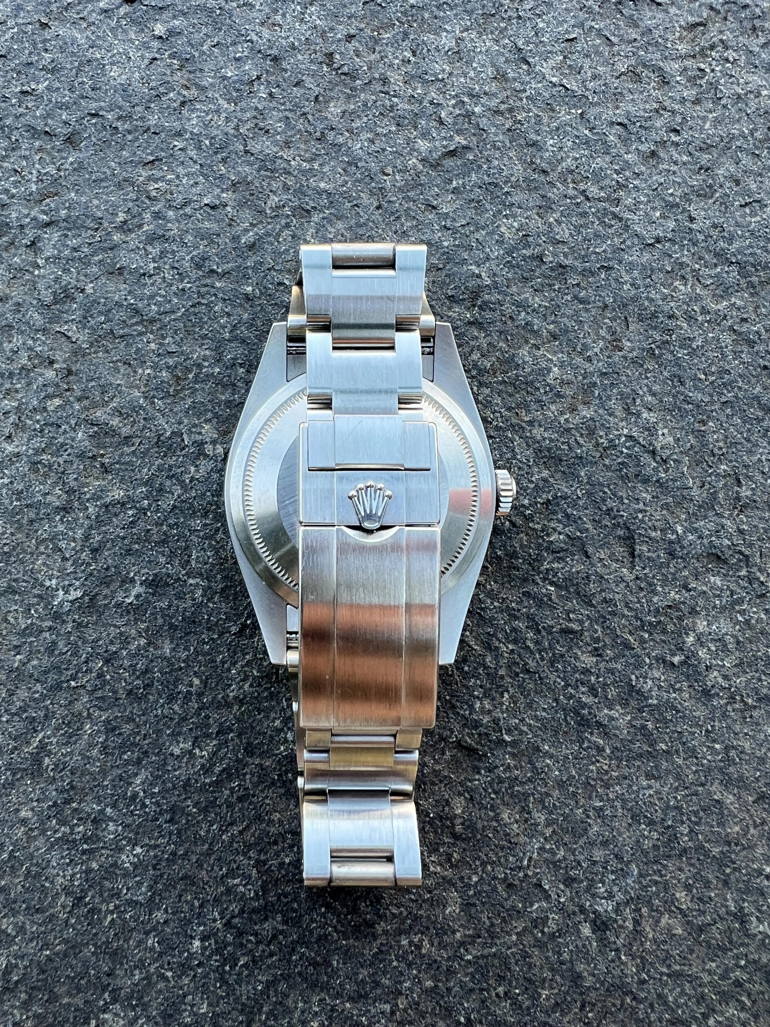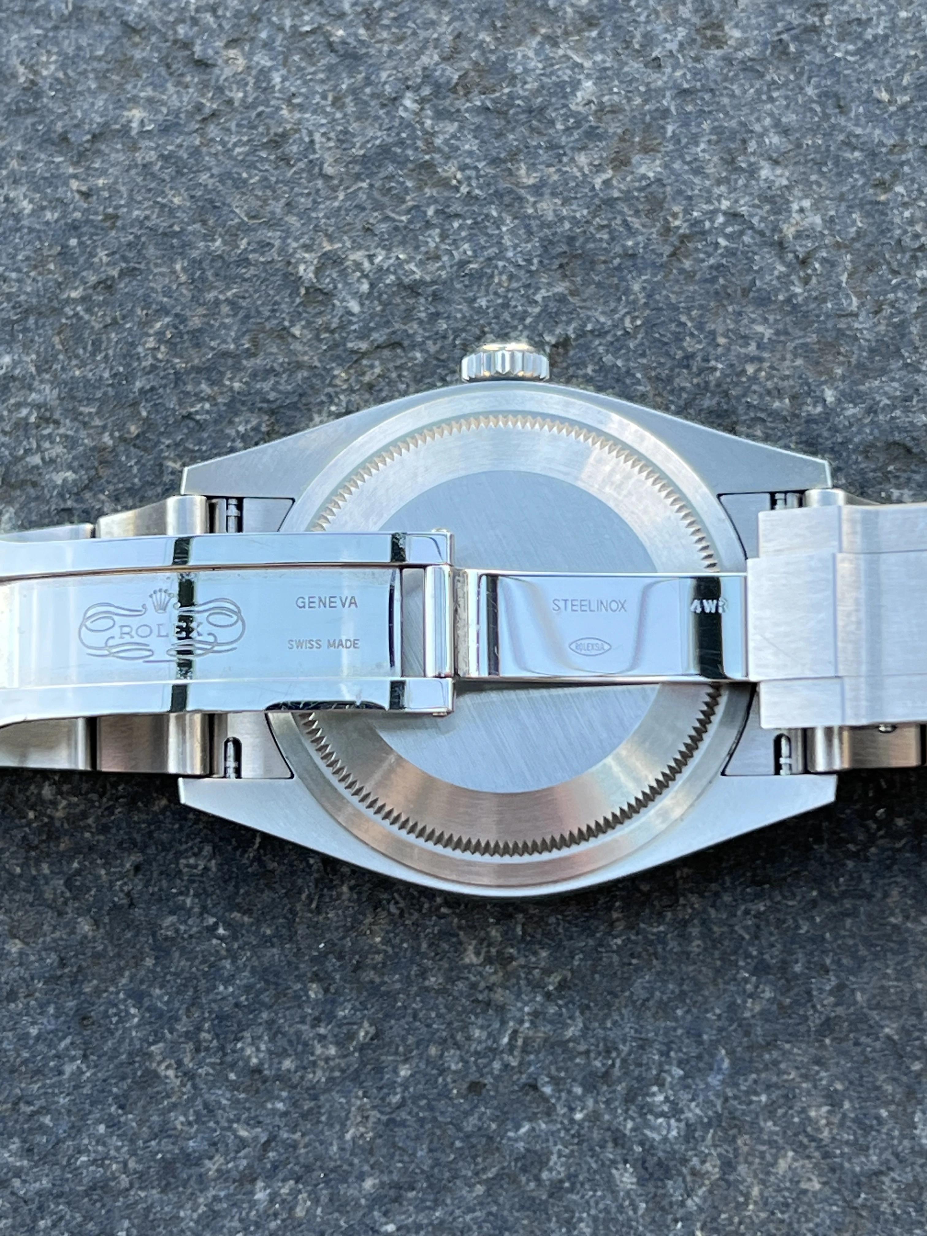 The watch was purchased new from the Rolex boutique in 2021 (still under warranty until 2026). It works perfectly and is in excellent condition. There’s a small ding on the upper left lug and small scratch on the clasp (see photos for details). The watch comes full box but at the moment I don’t have the boxes with me hence no photos.