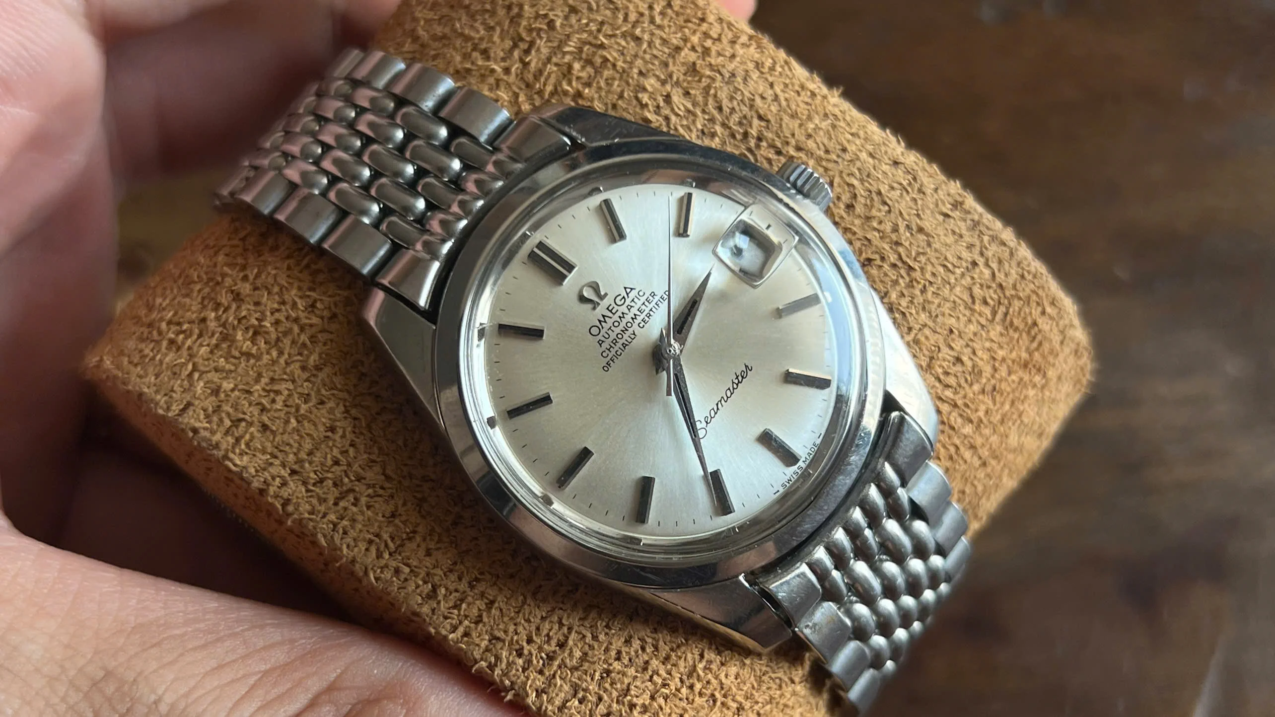 Offering here a 1969 Omega Seamaster Chronometer, reference 168.024, housing the Cal. 564 automatic chronometer-rated movement with quickset date. This is one of Omega’s most respected calibers from the period, known for its reliability and accuracy. The watch has been freshly serviced in September 2025 and is running well.