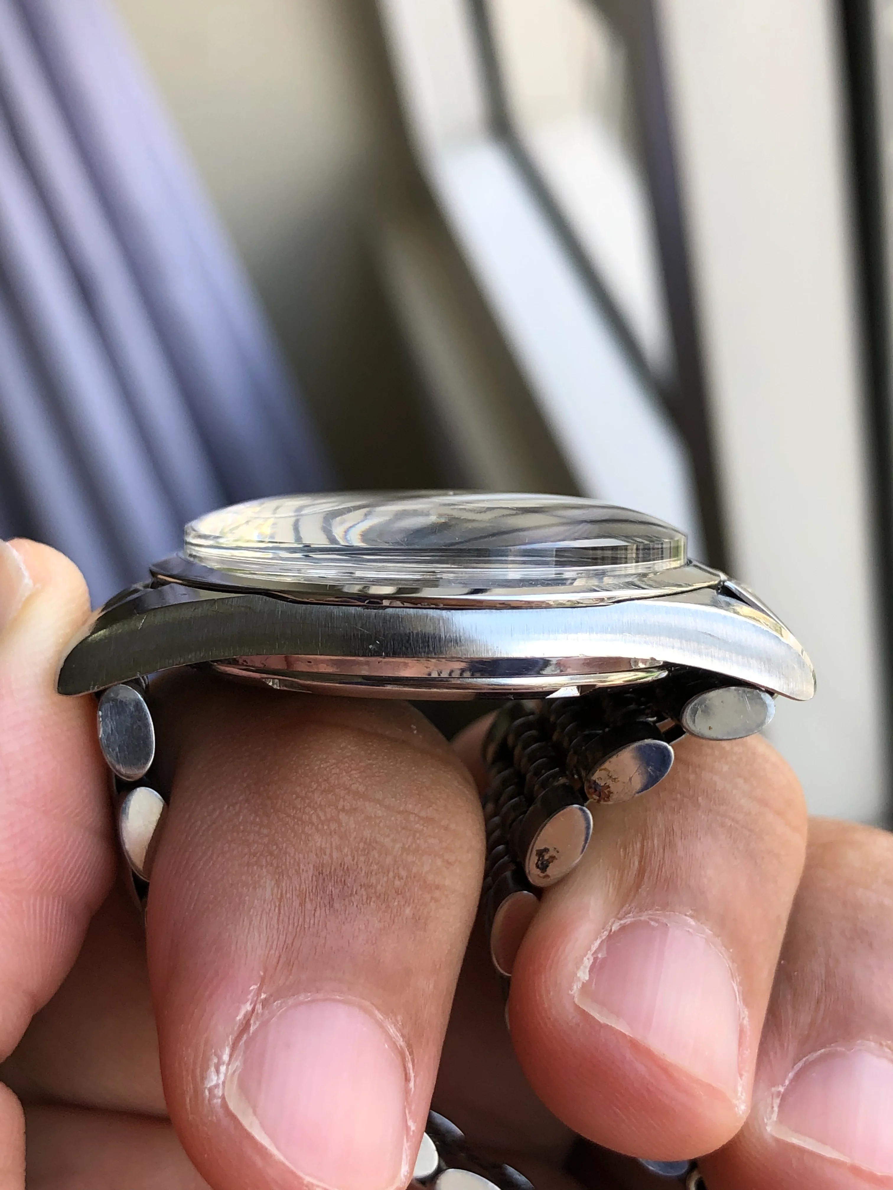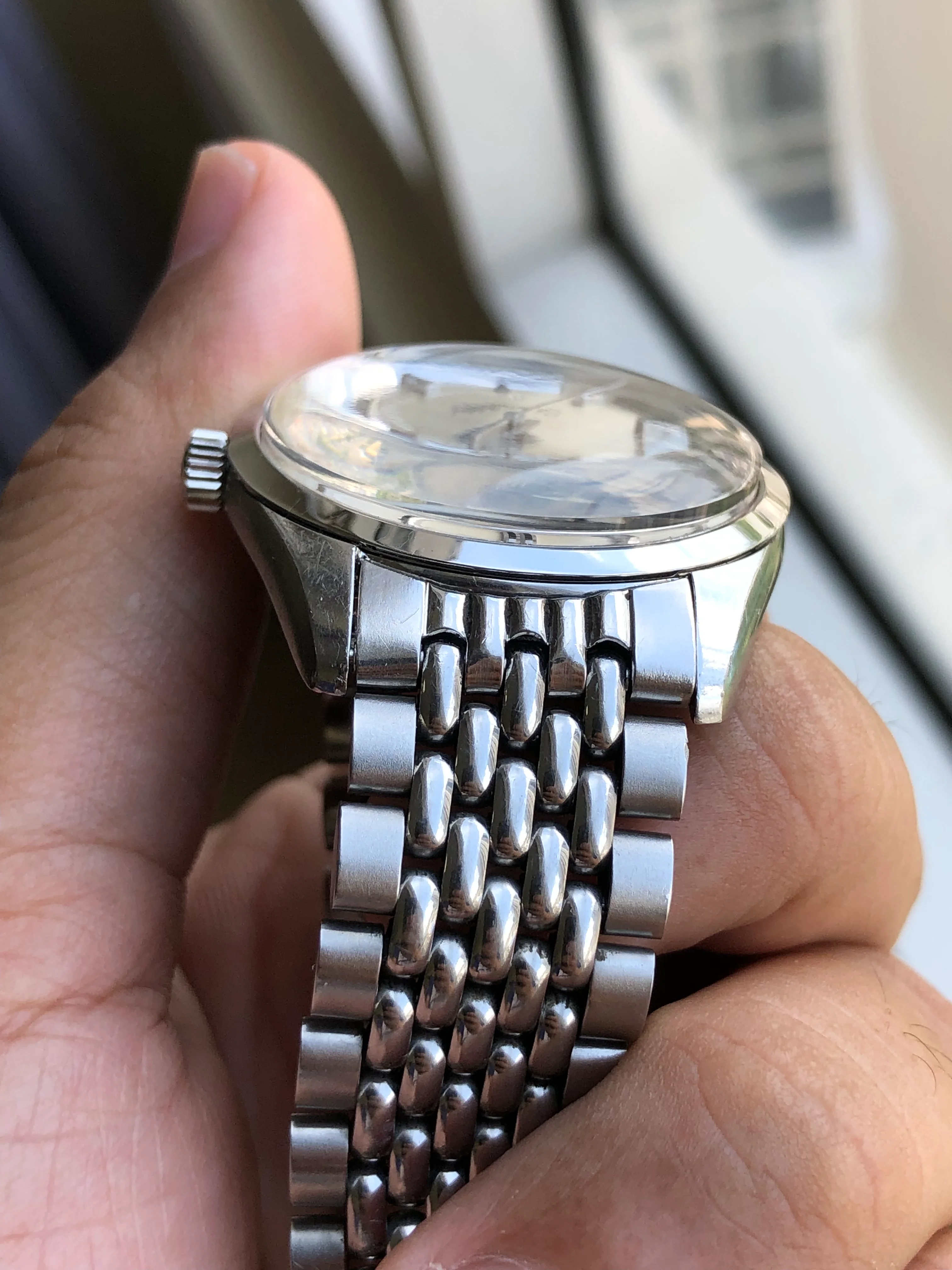 - Dial: Original white sunburst dial with black painted hour markers; faceted date-aperture frame at 3; dauphine hands; prints, hands and hour markers are all good.