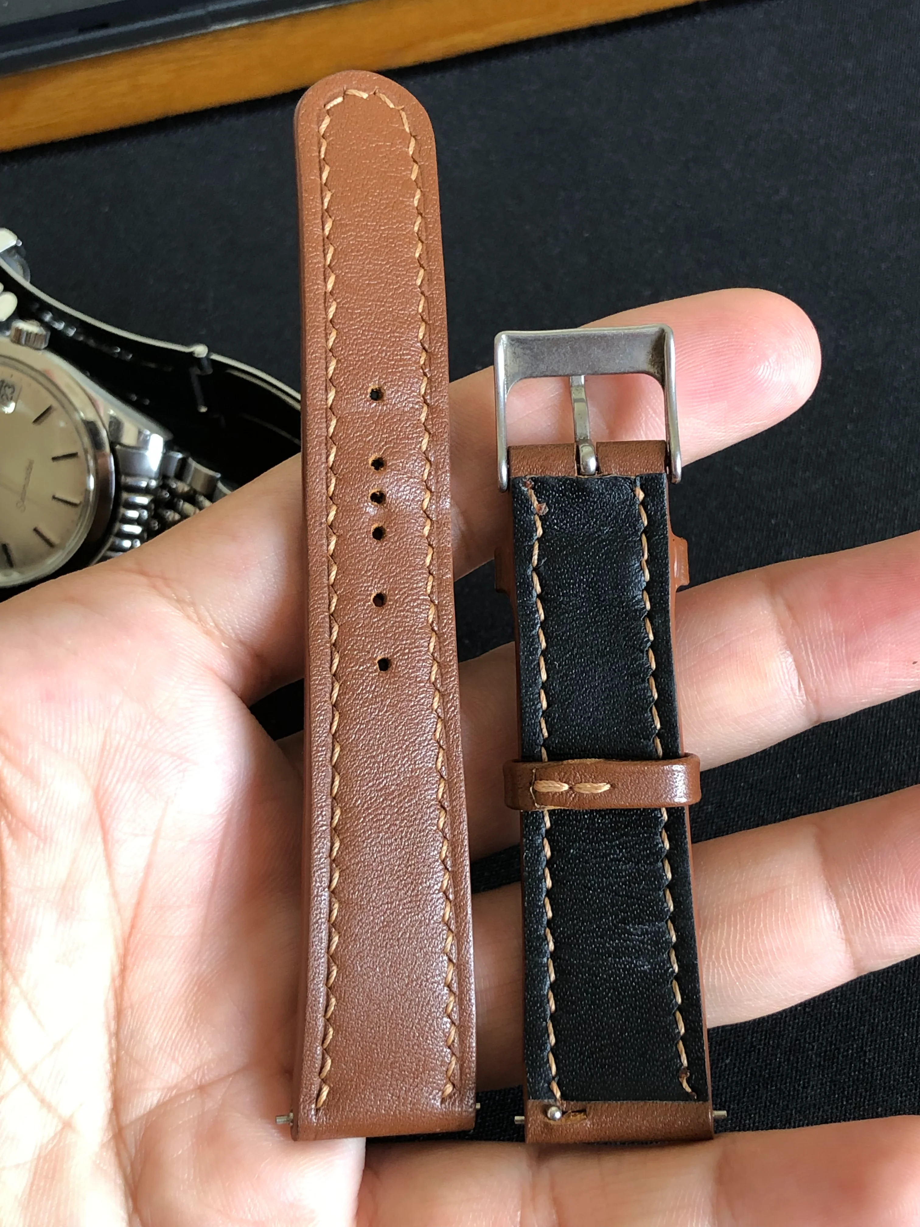 - Accessory: A handmade brown leather strap with quick-release spring bar, generic buckle.