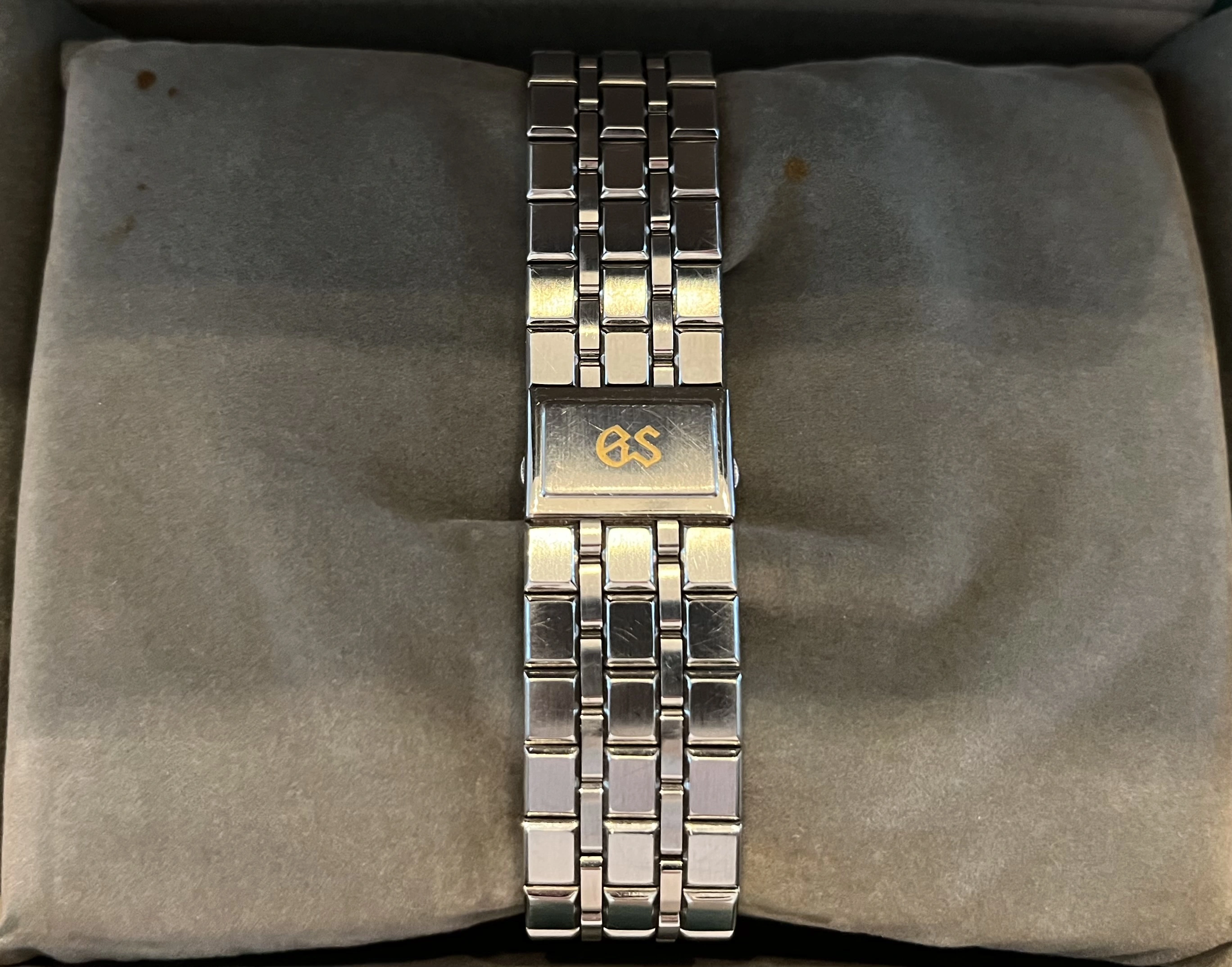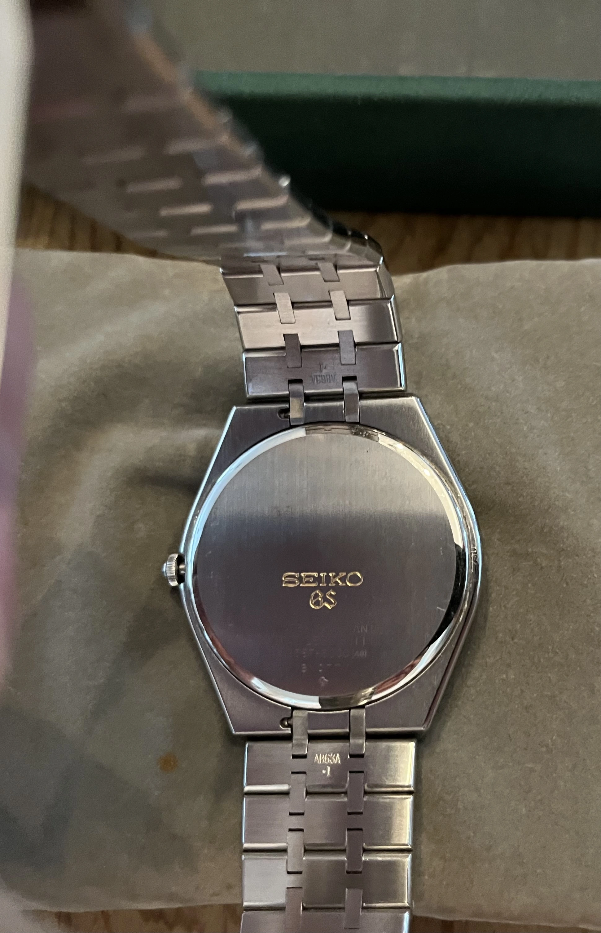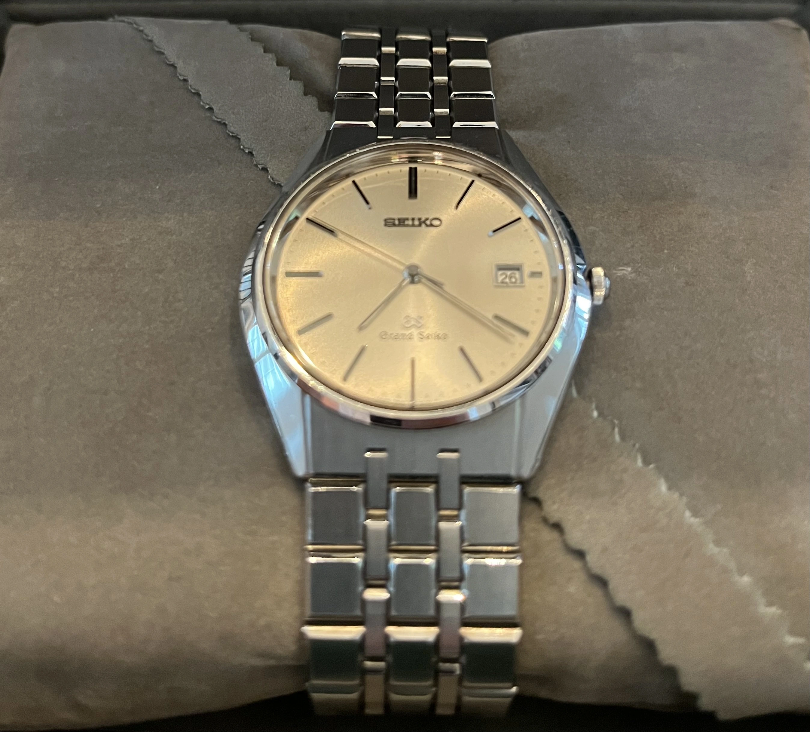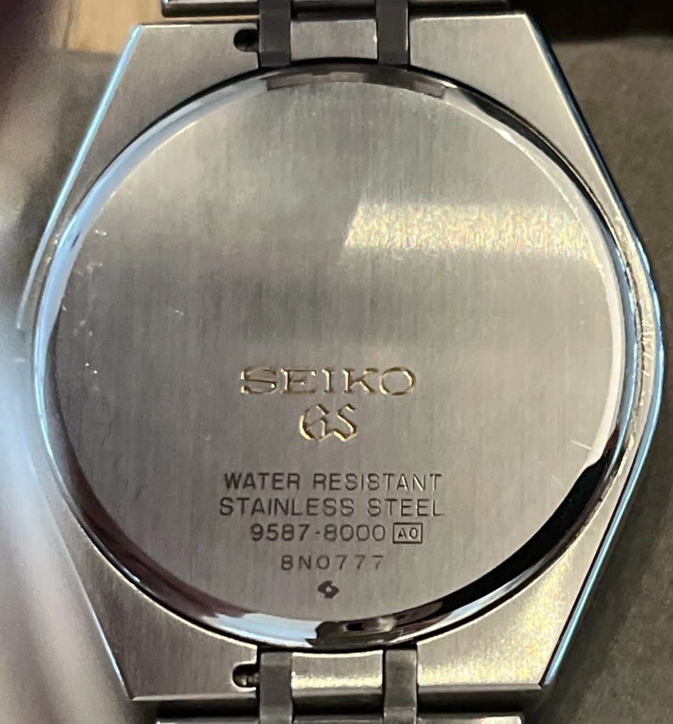 Grand Seiko SBGS003 (reference 9587-8000), a gorgeous example of Grand Seiko’s early quartz timepieces. Produced in the late 1980s, this model, dating to November 1988, displays the brand’s dedication to precision, craftsmanship and timeless design. The stainless steel case measures 36mm in diameter, resulting in a refined and versatile presence on the wrist. The crisp silver dial is beautifully simple, with hand-finished hour markers and slender dauphine hands that reflect Grand Seiko’s signature attention to detail. A framed date window at 3 o’clock adds practical functionality without disrupting the dial’s clean symmetry. Inside is the 9587 quartz caliber, an ultra-accurate, high-end movement manufactured entirely in-house by Seiko. Unlike mass-market quartz watches, the 9587 was carefully adjusted for greater accuracy, which is the spirit of Grand Seiko’s relentless pursuit of perfection. Completing the watch is a classic stainless steel bracelet that complements the case’s sharp lines, paired with a Grand Seiko embossed folding clasp, which will fit up to a 7.25” wrist very comfortably. Watch is in excellent, fully functional condition, has benefited from a recent battery replacement and comes complete with its rarely found with original inner/outer box set.