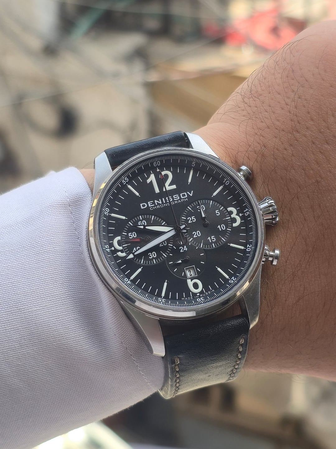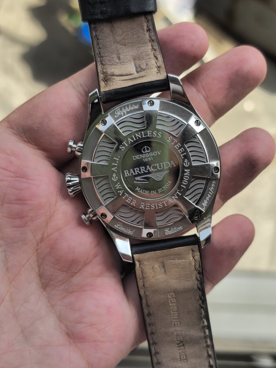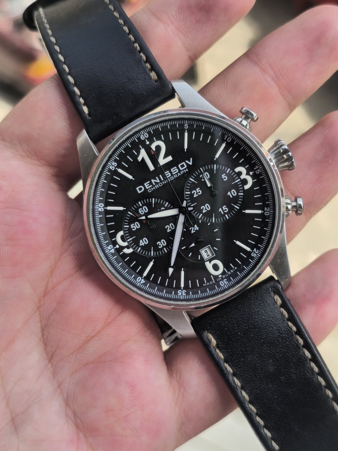 Denissov Chronograph Barracuda, a mechanical chronograph known for its military- inspired design and the use of well kbown Russian Poljot 31681 movement. Movement: Poljot 31681 mechanical chronograph, tri-compax with date,manual winding. Case size is 46mm. Strap is original but the Buckle after market. Limited to only 999 pieces. This is #941 Online comps are 700+usd My price 450usd shipped Feel free to ask any questions.....
