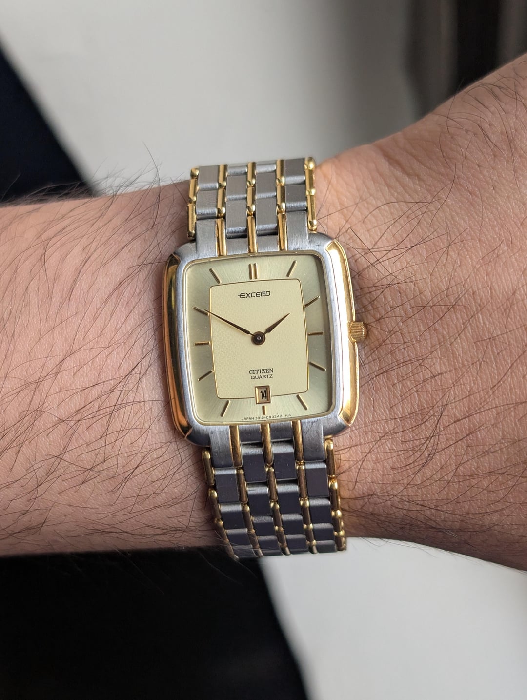 Greetings watchexchange. Up for sale is a spectacular vintage Citizen Exceed ultra slim tank with a beautiful integrated bracelet. The watch is in great condition as pictured and has a case manufactured in Germany. [Timestamp ](https://drive.google.com/file/d/1d1dhn0O3o-BwtYX7yB6XhzvxAmH9OdG_/view?usp=drivesdk) The bracelet will fit a wrist under ~6.5" so I'd recommend this for smaller wrists The watch is pictured on a 6.5" wrist for size reference. The watch is priced to sell at $149 paid via Zelle or Wise and shipped via UPS. Please allow 3 to 5 business days of your payment for the watch to be shipped out. Be sure to reach out to me if you have any questions or require additional photographs or information, I entertain requests for custom timestamps. Thanks for looking!