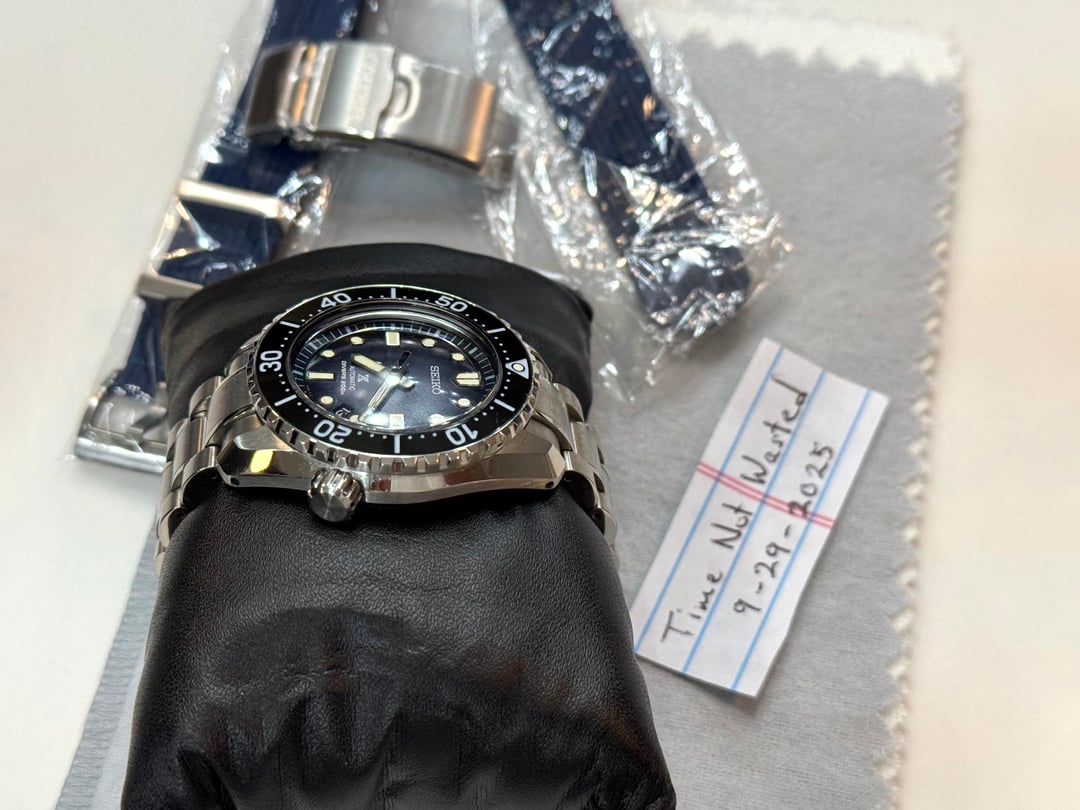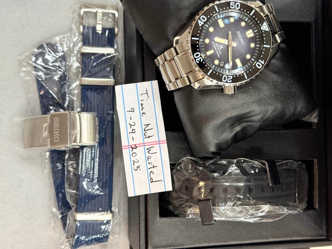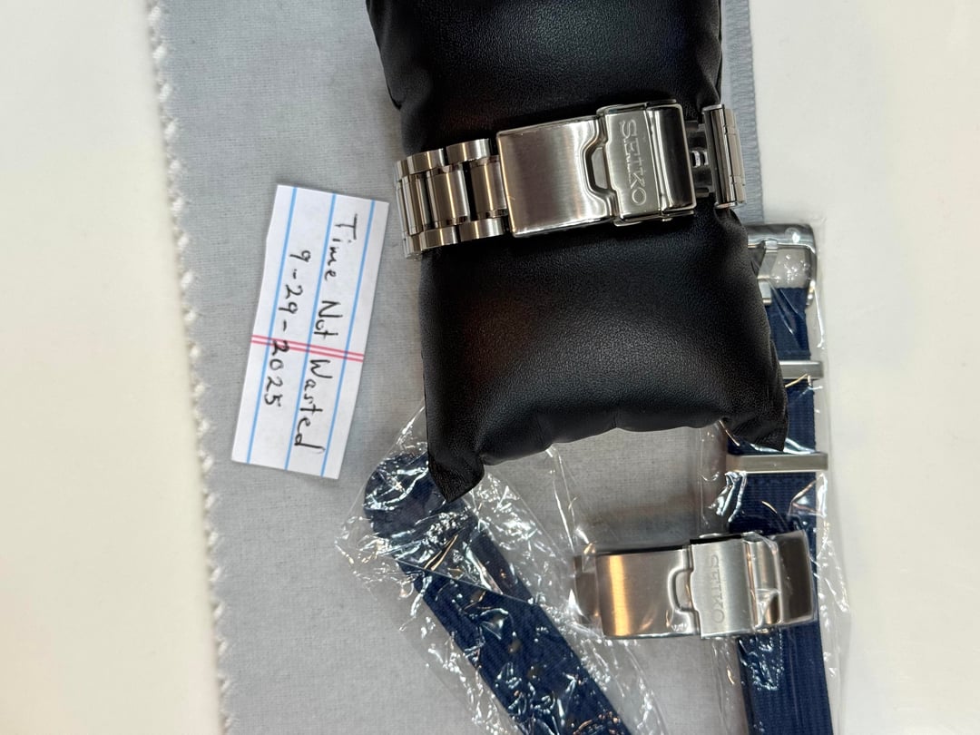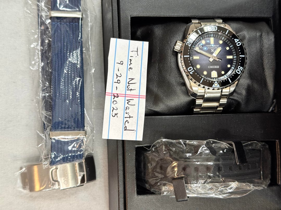 The Seiko SLA055 Marine Master MM200 Limited Edition is a premium timepiece designed for men. With its exclusive Ever-Brilliant Steel Case and dark blue fume dial, this watch is a highly sought-after collector's item. This Ultimate Edition comes with Seiko Bracelet ($350) and MM300 Clasp ($150). Known for their precision and reliability, Seiko watches are a popular choice among watch enthusiasts looking for quality craftsmanship and stylish design. Perfect for those who appreciate unique and exceptional timepieces. The Seiko SLA055 Marine Master MM200 Limited Edition watch is a standout piece in any collection. Missing original Nato, but included new aftermarket Nato Strap. Rubber strap is new and unworn. Original Clasp is new and unworn. Includes Inner & Outer boxes. Includes manual & warranty card. Original purchased Dec-2022. Bezel alignment is good, but not perfect. Timing has been roughly +4 seconds a day. Overall very good condition except for tiny nick on underside of case (last pic). Priced to SELL: $2,550 shipped Payment: Venmo or Zelle (G&S for well established Reddit, buyer pays 3.5% fees) Buy with confidence. Currently, 152 positive transactions on Reddit and counting. Happy to FaceTime with SLA055 in hand. Thumbs up appreciated if you like this post.