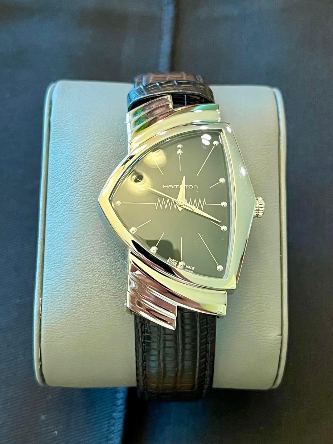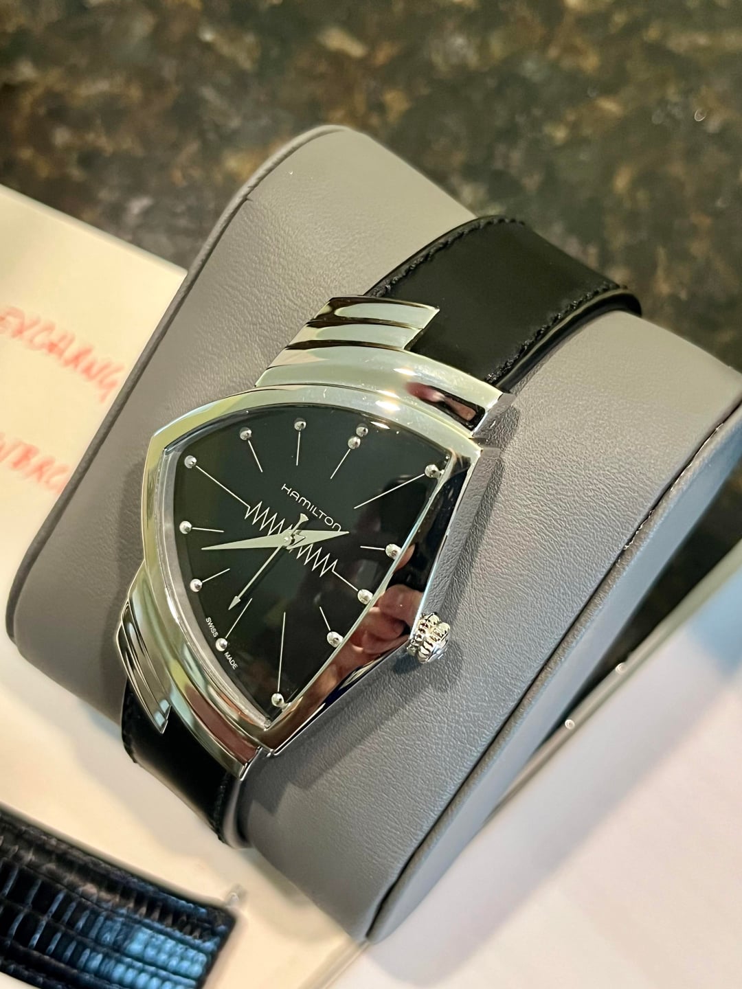 Hey folks! Selling a like-new Hamilton Ventura, H24411732. This is the standard quartz Ventura in the classic “Elvis” size…but far from standard in shape! Hamilton’s groundbreaking triangular watch, conceptualized by atomic-era designer Richard Arbib, was the first battery powered electronic watch, worn by Elvis and “twilight zone” creator Rod Serling! Lug-to-lug: 50mm Case width: 32mm Lug width: 17mm 50m water resistance ETA F05.111 movement, approx. 5 year battery life. **Condition:** Like-new. Zero scratches anywhere on the case, crystal or strap. **Includes:** Factory inner and outer box, AD-signed card, all manuals, and a new, unworn Veblenist 17mm black Cordovan strap. **Price:** $575 or best offer, shipped to the USA. **Payment:** PayPal F&F or Venmo. [timestamp!](https://imgur.com/a/gIIDJUQ) Thanks for looking and feel free to PM with any questions or offers.