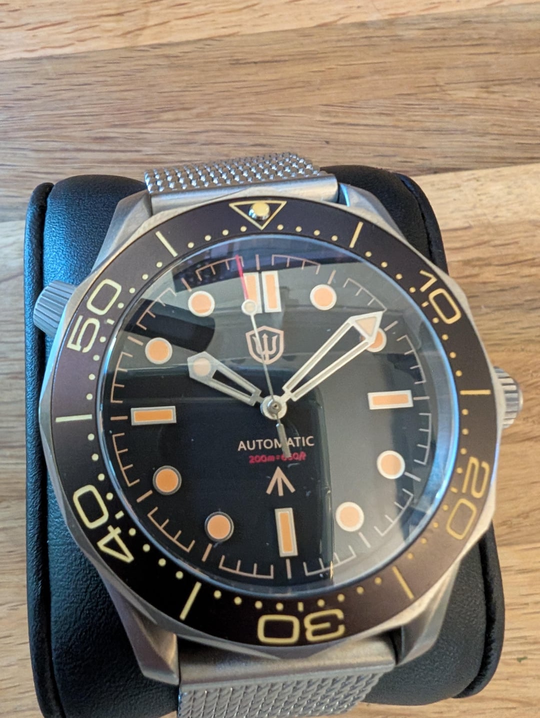 Watchdives NTTD for sale - one of the better homages out there. Lightweight titanium (\~54g without strap) with a hardened coating to prevent scratches. Respectable lume on the hands, dial, and aluminum bezel insert, though the retro color will fade faster. Bezel rotation is good, but not amazing which is typical of inexpensive titanium cases. Good condition overall. Comes with steel mesh strap, nylon strap, and watchdives travel case. Movement: Seiko NH35 Case size: 42mm (lug-to-lug \~49mm); 13.5mm depth Lug width: 20mm Crystal: Domed sapphire Water Resistance: 200m $110 USD F&F (or $115 G&S); shipped to CONUS, payment via PayPal, Venmo, or Zelle.
