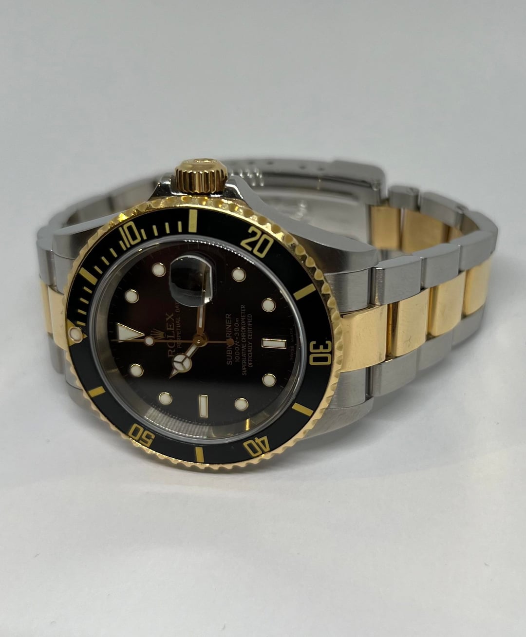 | Rolex Mens Submariner Date 18k Yellow Gold Stainless Steel Watch Black Sub 16613 beckertime (23864) |