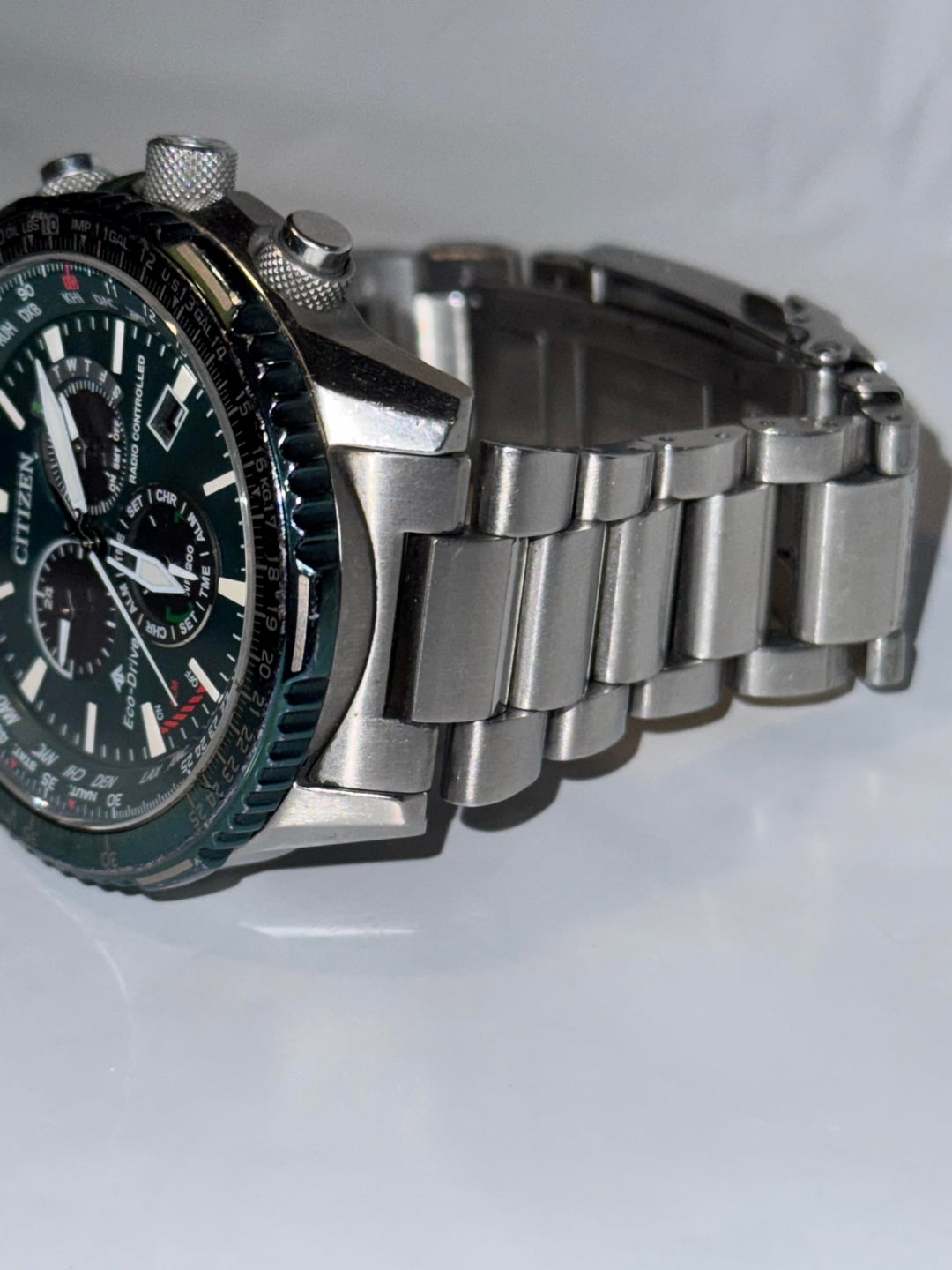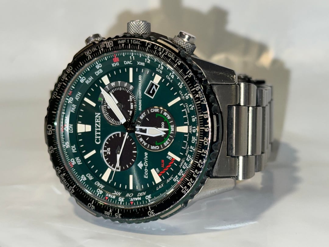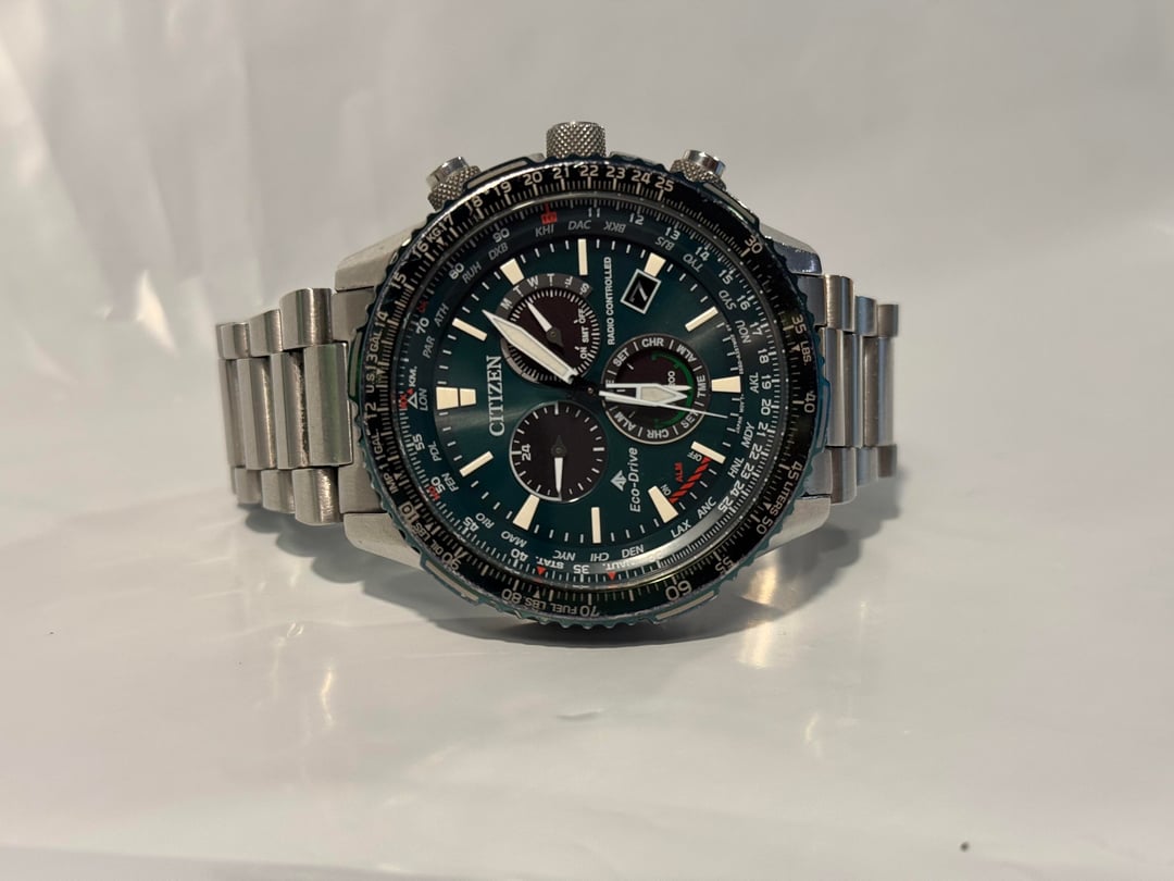Timestamp: https://imgur.com/a/x22kejs Disclaimer: My first post here and I’m hoping to become a regular as I’m downsizing my collection. Any pointers welcome! $385 OBO shipped CONUS Up for sale is my Citizen CB5004-59W Air A-T Eco-Drive Chronograph. Runs flawlessly and keeps time perfectly thanks to its atomic synchronization — no battery ever needed since it’s powered by light. 46mm stainless steel case, green dial with luminous hands and markers, and a sapphire crystal that’s completely clean and scratch-free. The bezel and bracelet show some normal wear, bezel has small scratches and dings (did my best to photograph them). The dial and crystal are pristine. Features the E660 movement with atomic timekeeping across 24 time zones, 1-second chronograph (up to 60 minutes), perpetual calendar, 12/24-hour time, alarm, power reserve indicator, and day/date display. Water resistant to 200m. Stainless steel bracelet with a push-button fold-over clasp.