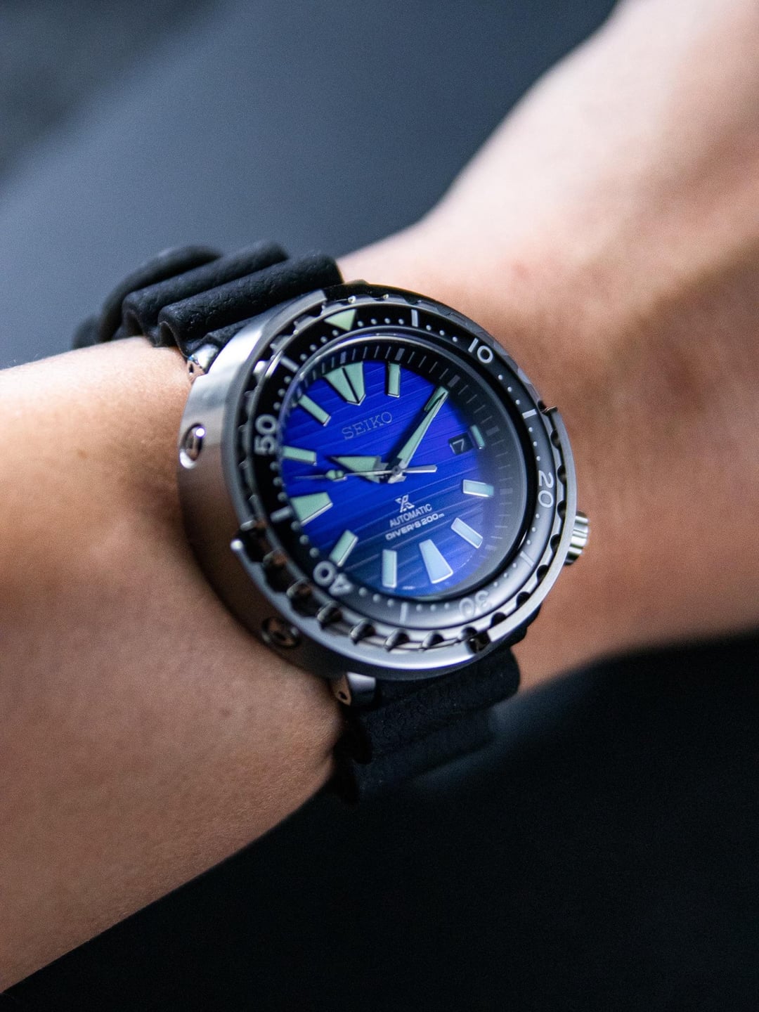 hello all i have a super fun mod up for sale today! this is another personal custom_chrono-designed seiko mod i wanted to do a mod with the tuna case again because it’s been quite a while, and i am really happy with how it all turned out. the dial is quite beautiful and reflects in the light very nicely! i love the blue to black gradient on it. this is a lume monster too and i included a lumed date wheel to up the lumey-ness the dimensions are 47.5mm diameter, but the kicker is the 44.5mm lug to lug! extremely wearable even on smaller wrists. it has 22mm lugs and 14.5mm thick with a domed sapphire crystal. i’ve regulated the movement quite nicely as well! i’m asking $365 shipped CONUS via USPS priority mail for this gorgeous mod. as always feel free to send me a message with any questions you may have