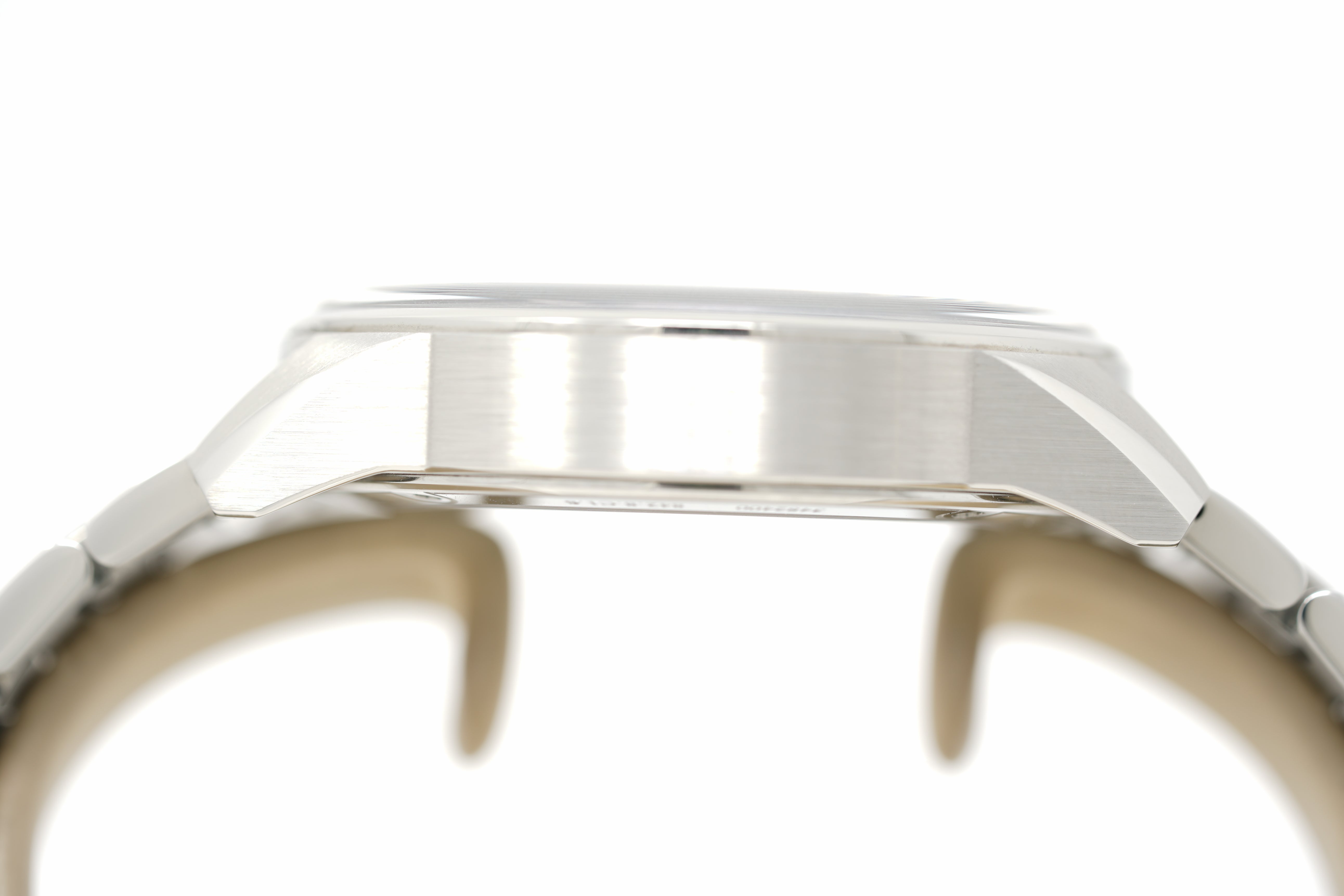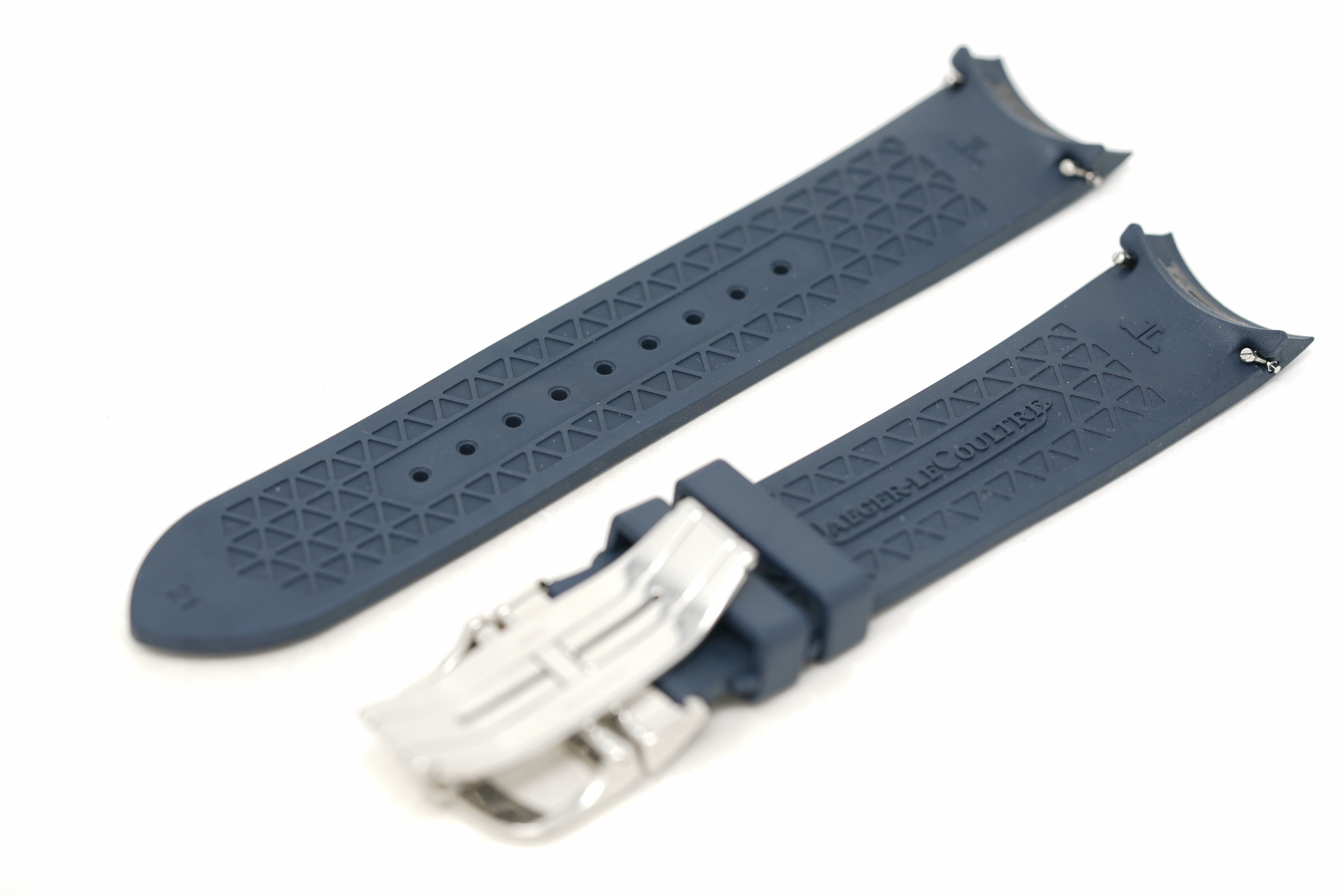 This pre-owned watch is in 85% condition due to slight marks on the lugs (specifically a nick on the 5 o'clock lug) and throughout the case. The bracelet is in 86% condition due to slight marks on the links and clasp. Also included is an OEM strap in 93% condition due to slight wear and marks on the clasp. Originally purchased in January 2022, this watch comes with its inner and outer box, instruction manual, warranty card extended through January 2030, hangtag, and the one-year Topper Pre-Owned Select warranty. The original Jaeger-LeCoultre inner box is in fair condition due to peeling.