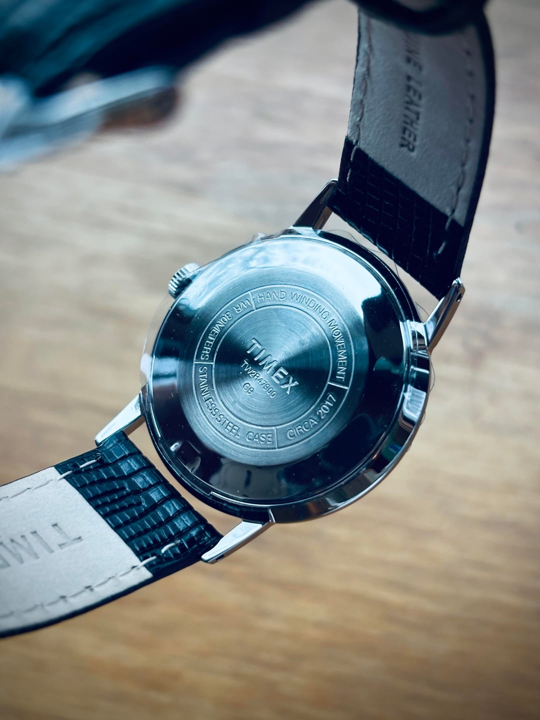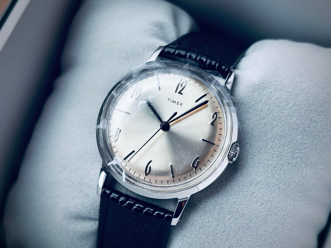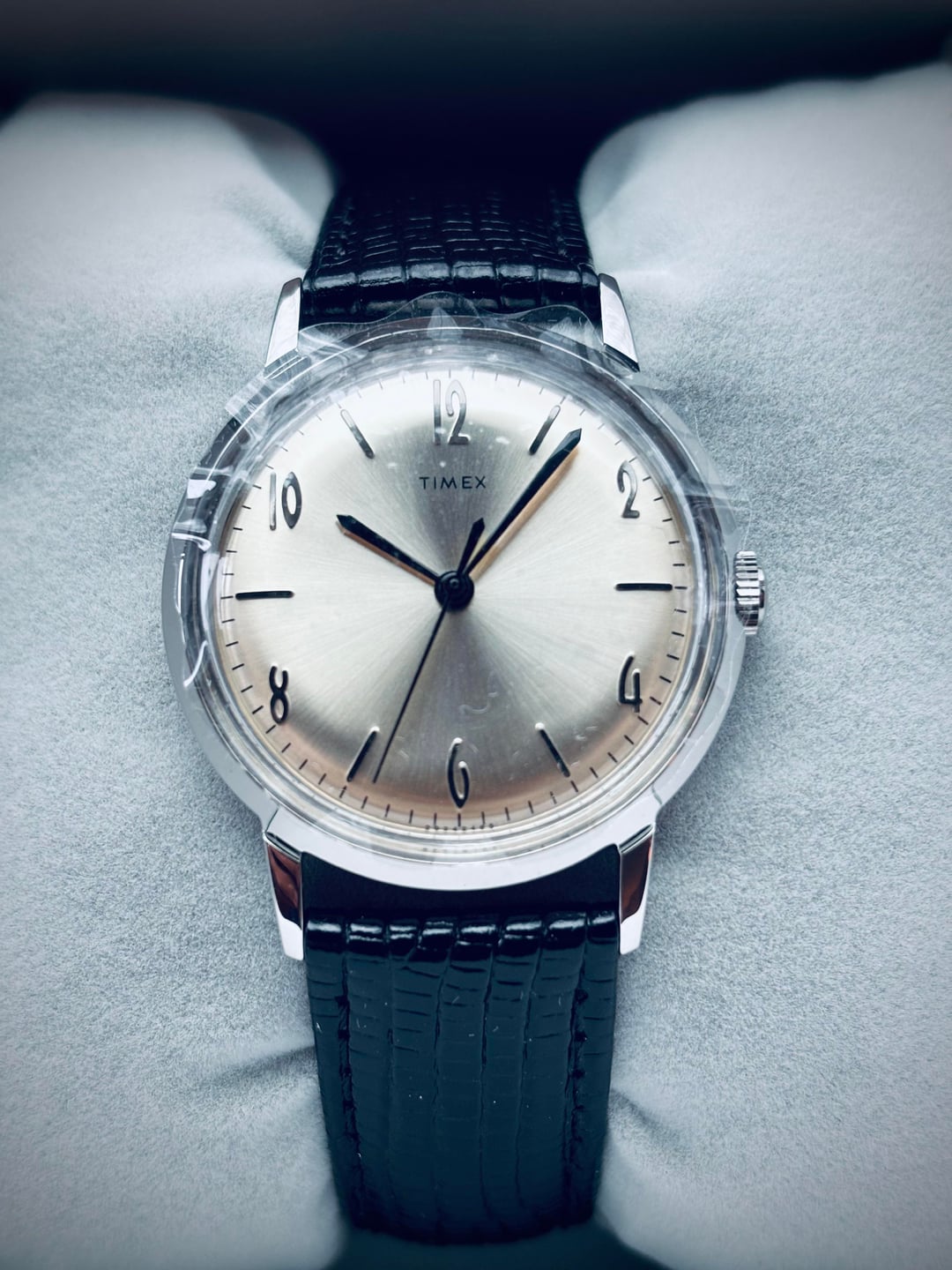 **No trades, thank you.** Price (includes CONUS shipping) Zelle/Wise/Venmo/Wire: $199 Time-stamp & Full Kit: https://imgur.com/a/laBLrtQ **The Scoop** Up for sale is the timeless classic Marlin 34-mm re-issue from Timex. The watch and OEM leather strap are in new/mint condition with protective stickers in place. Notable Specifications: Case Dimension: 38 mm Lug Width: 18 mm Thickness: 10 mm Water Resistance: 3 ATM Movement type: Hand-winding Crystal: Acrylic **What You Get** The full kit includes the original branded box, instruction manual, and hang-tag. **Payment & Shipping Stuff** Payment options include Zelle (preferred), Venmo, Wise, or bank wire. Ships fully-insured with required signature in the CONUS (included in the asking price). I would be willing to discuss international shipping options from the United States and happy to answer any questions about the watch. Cheers, SB