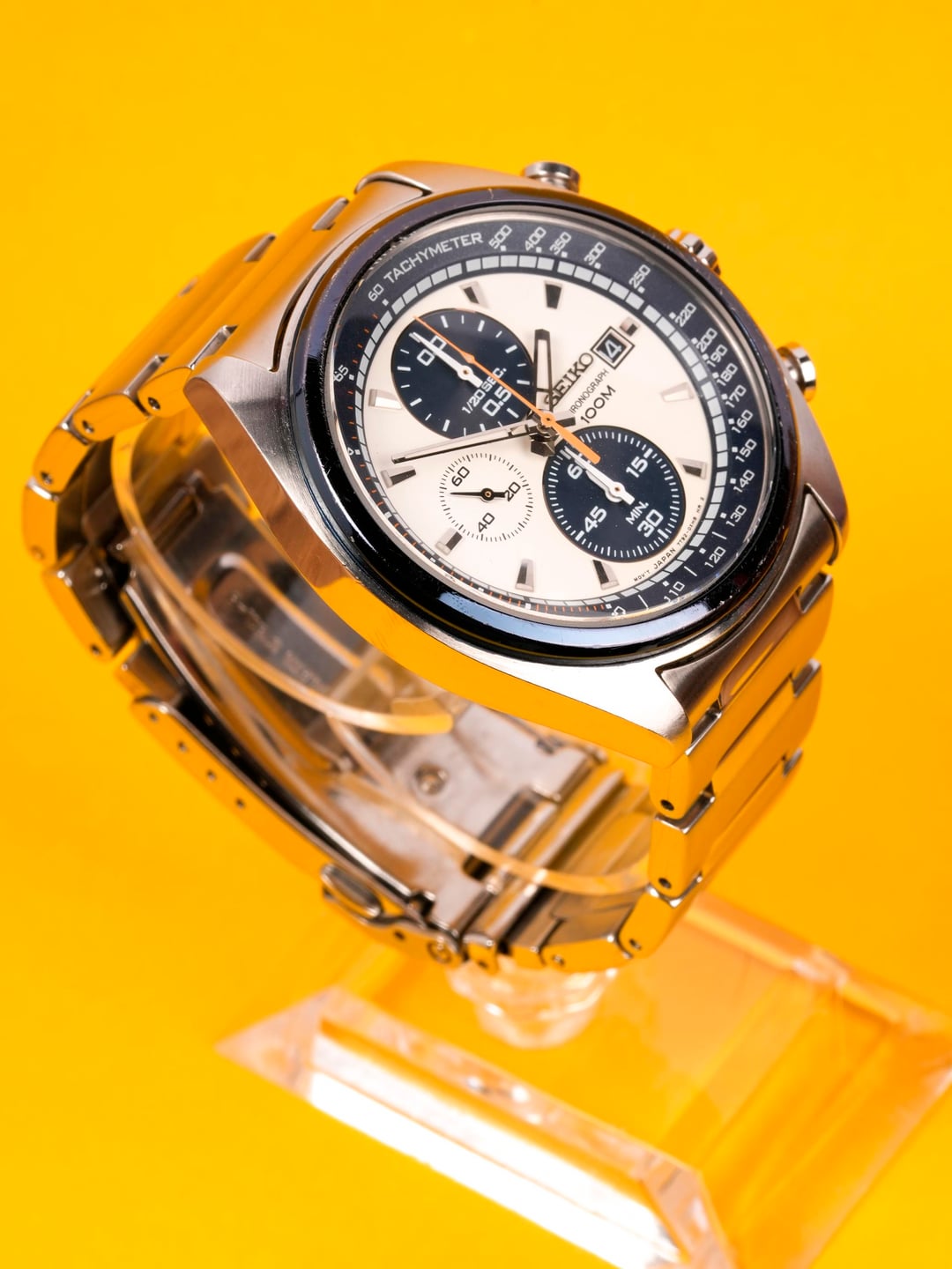 Seiko cushion-case style Chronograph on bracelet - Neo Sport Model SNDF87P1. Beautiful ivory dial with dark blue chapter ring and bezel. Very much in keeping with the design ethos of the classic Speed-Timer range this delightfully racy chromo has a fun super-smooth multi dial flyback feature. In exceptional condition this is a stylish piece that’ll compliment any Seiko lover’s watch box. Please see photos for cosmetic condition. Note: so you know exactly what you will get I have provided macro photos but please remember these will show wear invisible to the naked eye. 💵 Price: $360 USD + $35 USD shipping (insured shipping costs me around $70-$80, so I cover half). Images, Video & Timestamp [https://imgur.com/a/bo1EouW](https://imgur.com/a/bo1EouW)