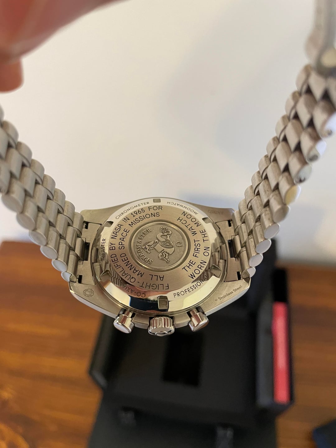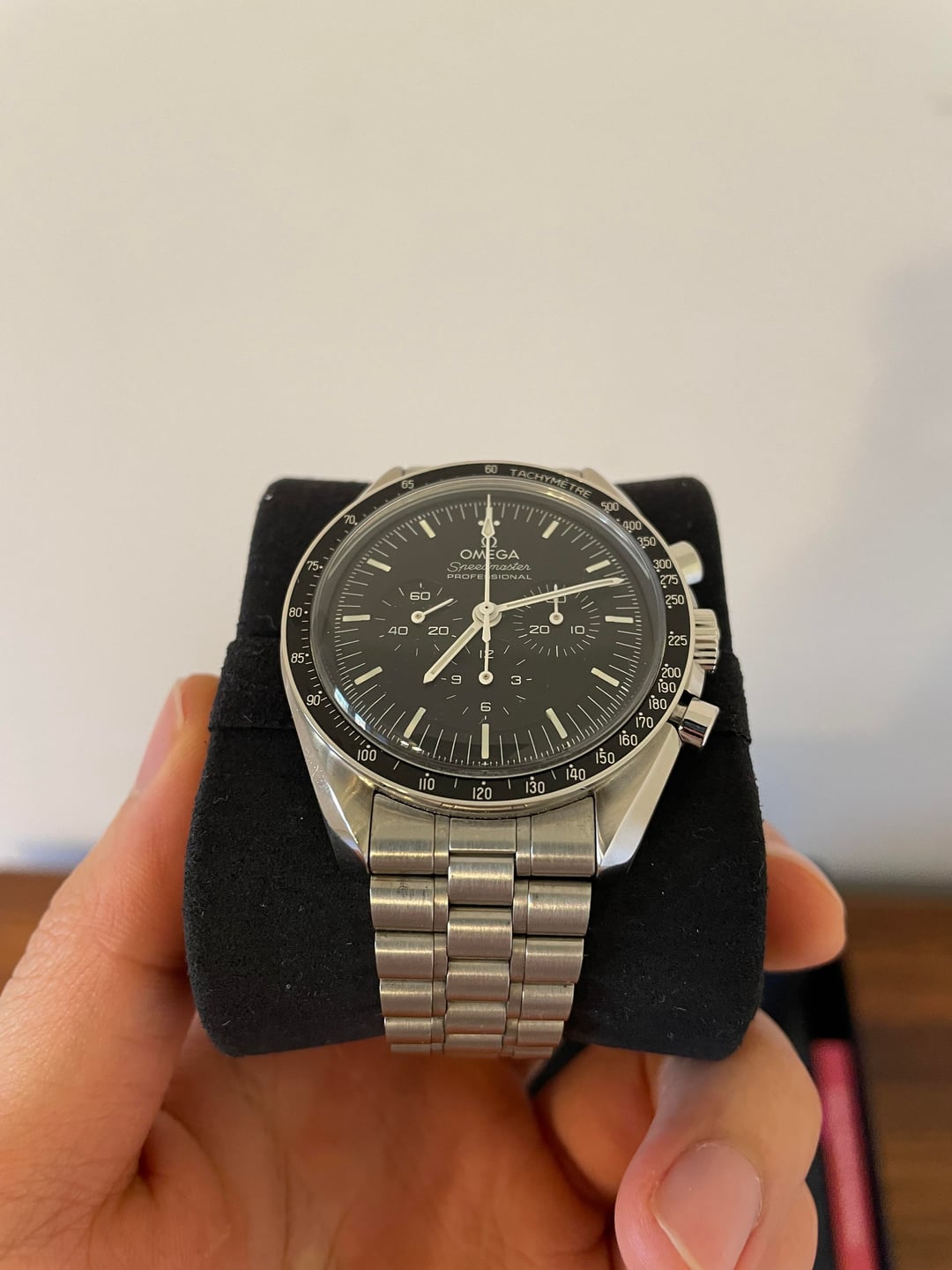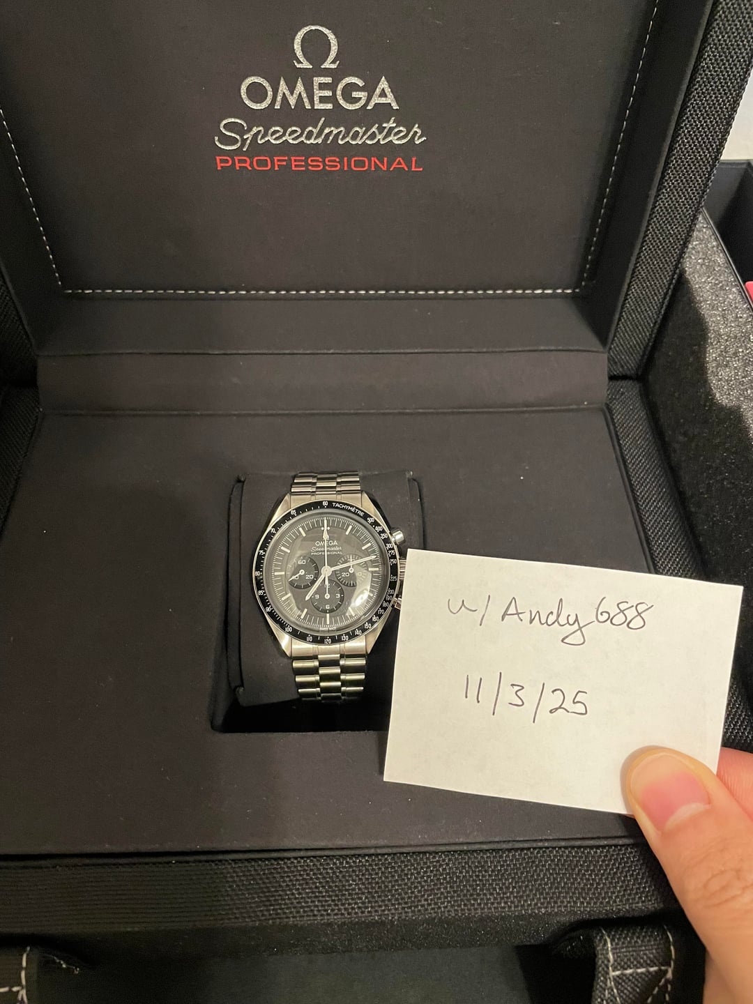 Selling my 3861 speedmaster professional hesalite since it doesn't get enough wrist time. Watch is in excellent condition with a few light swirls on the clasp from desk diving. The hesalite crystal has a few hairlines that are easily removed with polywatch. I tried to capture everything in the images but mentioning it here for transparency. The warranty card is dated April 2022, so it has the previous clasp without micro adjustments. Includes box, instruction manual, moonwatch propaganda leaflet, and pictogram/warranty cards. Currently sized to my 6.75 inch wrists but comes with 7 extra links. Reference number: 310.30.42.50.01.001 Asking $4850 shipped, CONUS only. I accept Zelle, bank wire, Venmo, or PayPal F&F. I will ship fully insured via USPS Priority or equivalent UPS/Fedex 2nd day. Happy to answer any questions, send additional picutures, or hop on a facetime call.
