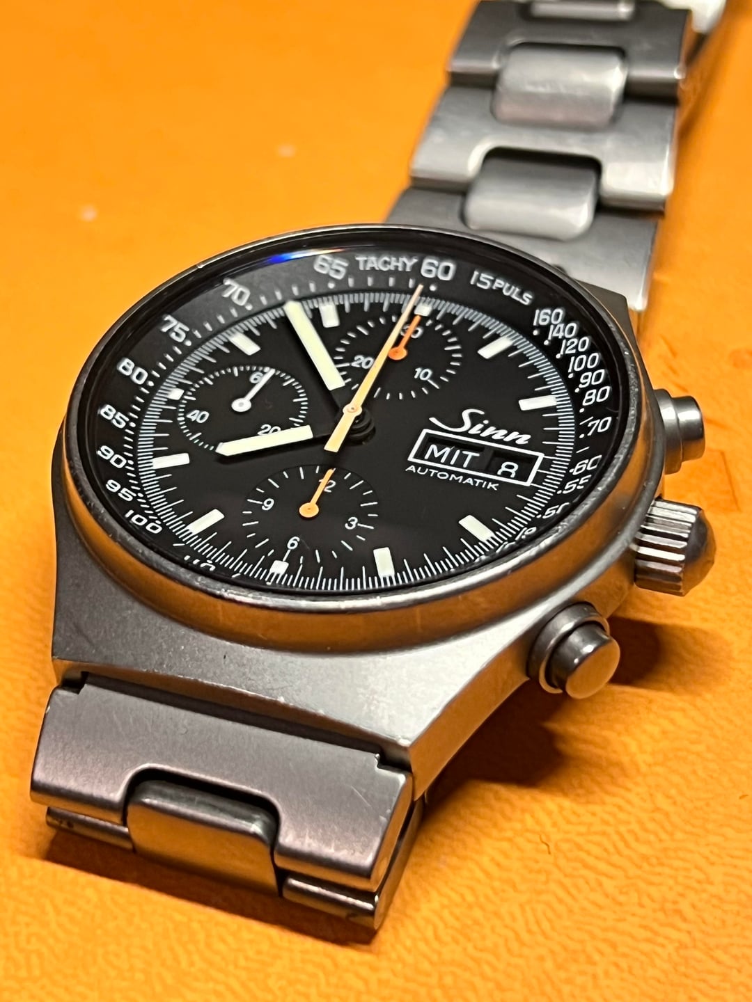 Up for sale is my Sinn 144 titanium from 2002. I’ve worn this watch almost daily for the past 2 years and it has never let me down. This watch is definitely well loved and it shows, the case has some small dents and scratches but the movement was serviced in 2023 and keeps excellent time (+/- <5 sec/day). There is a small but barely noticeable scratch in the sapphire between the 4 and 5 hour markers. The chrono works flawlessly and the pushers are tactile and smooth. Includes papers (no box) and original titanium bracelet. Looking for ~~$2,500~~ $2400 USD via PayPal or e-transfer + shipping. Located in Canada but willing to ship to CONUS at buyer’s expense. Also open to trades for field/GADA watches, à la omega Railmaster, Tudor ranger, etc. Also on the lookout for a Sinn 244 Ti.