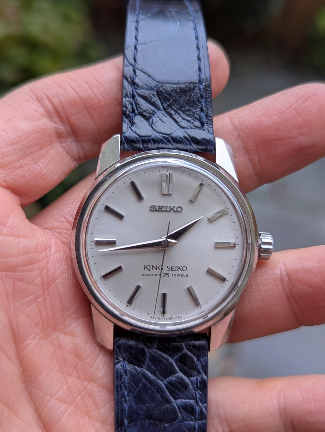Hey folks, up for sale is my 1960s King Seiko 44-9990 44KS, serviced 2025. A great condition example of a well known reference. Vintage lovers will know this one and plenty of ink has been spilled about it, here's just one article for reference: [Fratello](https://www.fratellowatches.com/king-seiko-44-9990-undeniable-vintage-masterpiece/#gref) Specs: 36.5 mm diameter, 43 mm lug to lug, 11.1 mm thick, 19mm lug width Notes: * [Album with video and timestamp](https://imgur.com/a/dclBueg) * Running well, no issues with the movement and winds without problems * Along with its 2025 service, received an overhaul and has no significant wear marks; unlike many vintage watches of this period, the dial is free of blemishes or discoloration * Comes on a lightly worn Tuns navy ostrich strap Happy to get on a video call or meet up in the DC area to show the watch - as someone who's gotten into vintage recently I know it's a nuanced subset of the hobby so happy to provide any info I can. Asking $750 CONUS shipped via Paypal, Venmo, or Zelle - thanks for taking a look!