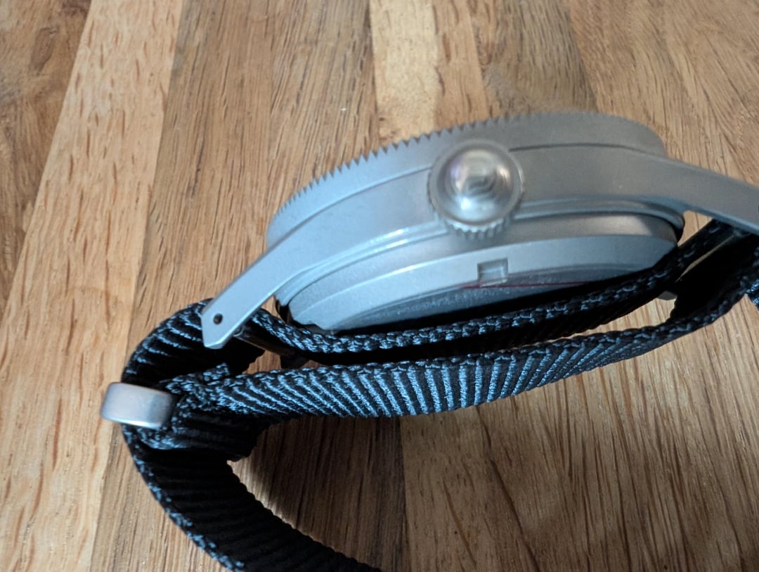 Watchdives 50 fathoms v2 homage for sale. This model has some improvements such as 20mm lug width (compared to 19mm) and the lug length shortened slightly to make it more wearable. Stainless steel with a titanium color sandblasting and matte ceramic bezel insert. Some light scratches near the crown (see photos). Uses a no-date NH38 movement that is running at +5/day according to the watch accuracy app. Good bezel action and respectable lume on the hands, dial, and bezel insert. Comes with nylon strap and travel case. Movement: Seiko NH38 Case size: 40mm (lug-to-lug \~48mm); 13.25mm depth (with domed crystal) Lug width: 20mm Crystal: Domed sapphire Water Resistance: 300m (claimed) $85 USD F&F (or $90 G&S); shipped to CONUS, payment via PayPal or Venmo.
