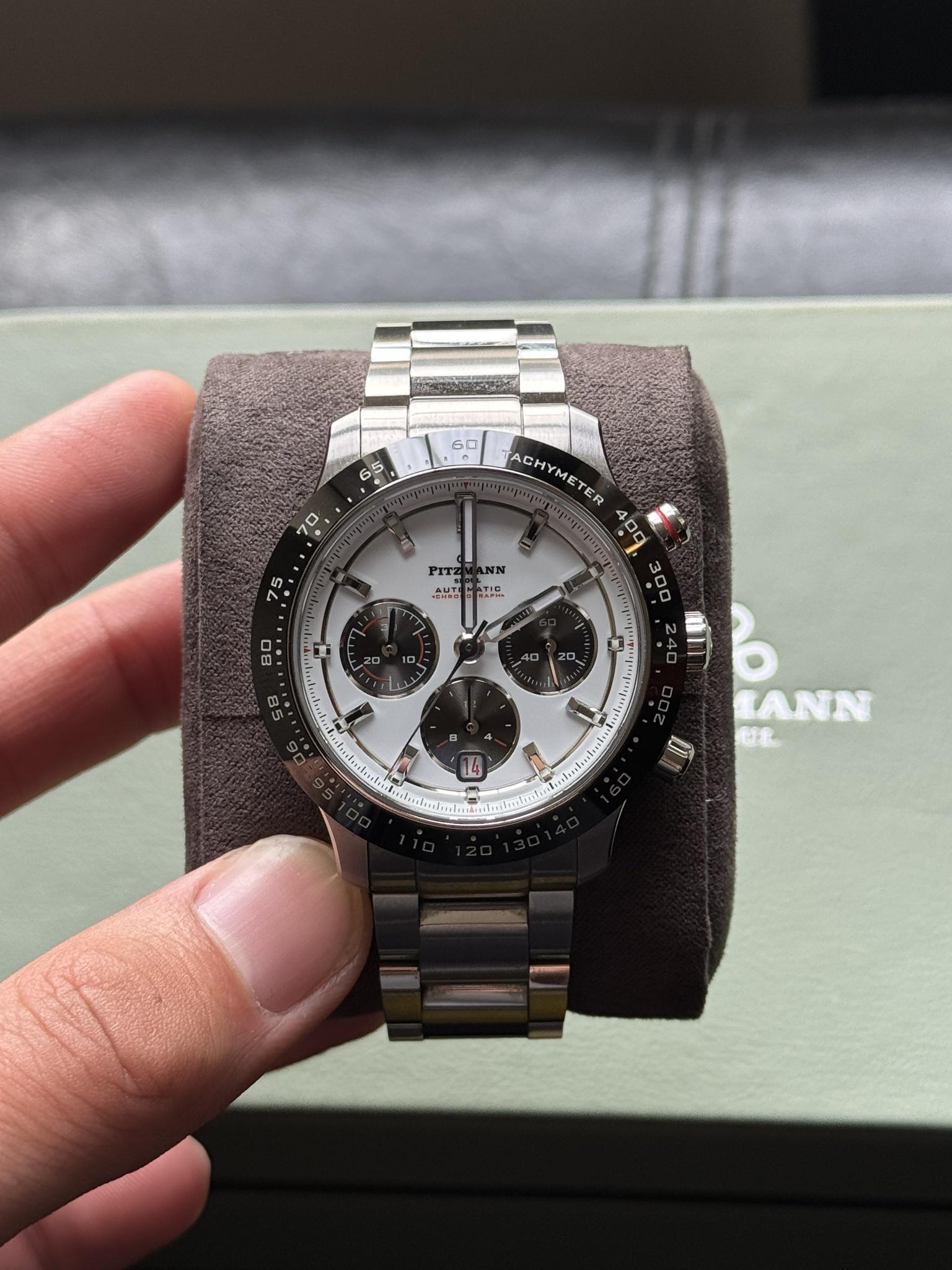 Timestamp: [https://imgur.com/a/RpoZoub](https://imgur.com/a/RpoZoub) Album: [https://imgur.com/a/J2DWWbP](https://imgur.com/a/J2DWWbP) Up for sale is my personal Pitzmann 3 in the panda colorway. Great value with great fit and finish from Pitzmann. Pitzmann 3 currently retails for $1,300 (excl. taxes/tariffs, and shipping) on the Pitzmann website and being discontinued soon. Included in this package is Pitzmann’s proprietary micro adjustable clasp, retailing at $100, fitted onto this watch. Cool white dial with double AR coating allows for tons of light play. Further brand info and watch details: [https://www.pitzmann.com/shop/p/pitzmann-iii-cj5ex](https://www.pitzmann.com/shop/p/pitzmann-iii-cj5ex) Micro adjustable clasp: [https://www.pitzmann.com/shop/p/micro-adjustable-clasp](https://www.pitzmann.com/shop/p/micro-adjustable-clasp) **Condition**: Overall good condition 8.5/10. Winds great and the Seiko movement keeps great time as usual. **Movement details**: Seiko 8R48 movement, automatic chronograph; categorized as a *near* Grand Seiko level movement. One of the thinnest automatic chronograph watches on the microbrand market. **Watch Specifications**: · Diameter - 40mm (41mm with the Bezel) · Lug to Lug - 47.5mm · Thickness - 13.25mm · Water Resistance - 50m · Glass - Sapphire, double-sided AR coating · Movement - SEIKO Caliber 8R48 (NE88) · Power Reserve - 45hrs **What’s included**: Box/Papers, Watch, Micro-adjustment clasp (purchased separately; $100 value), old clasp, and all spare links. **Retail Price**: $1,300 for watch + $100 for micro adjustable clasp = $1,400 value **Selling Price**: $900 shipped **Payment**: Zelle or Paypal Friends only **Trades**: Sale preferred, but will listen to trade offers