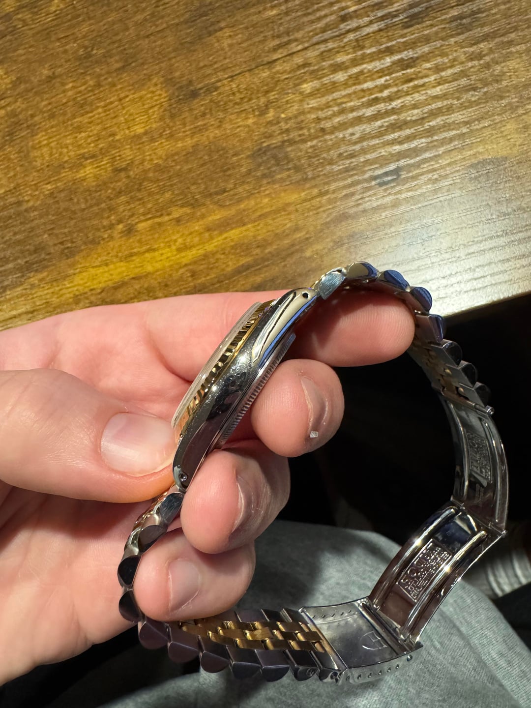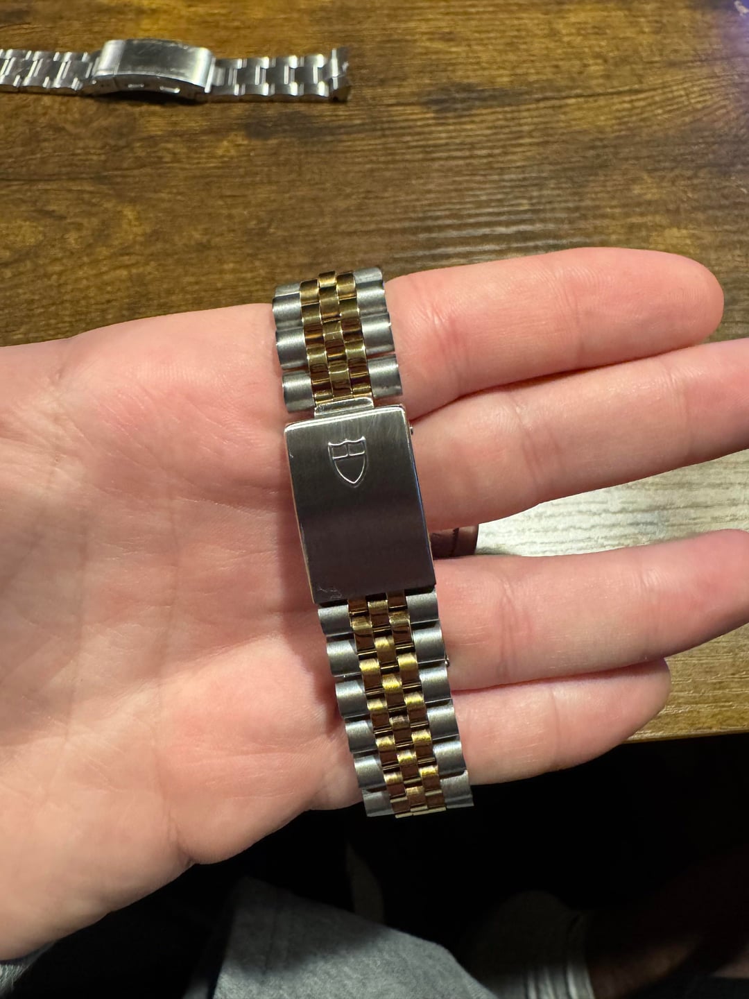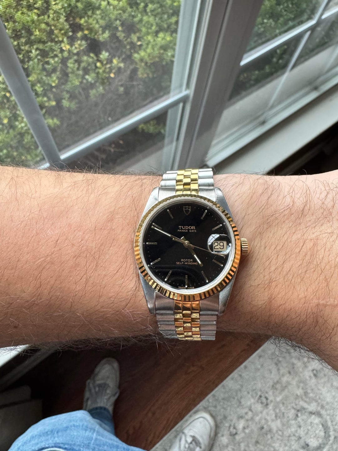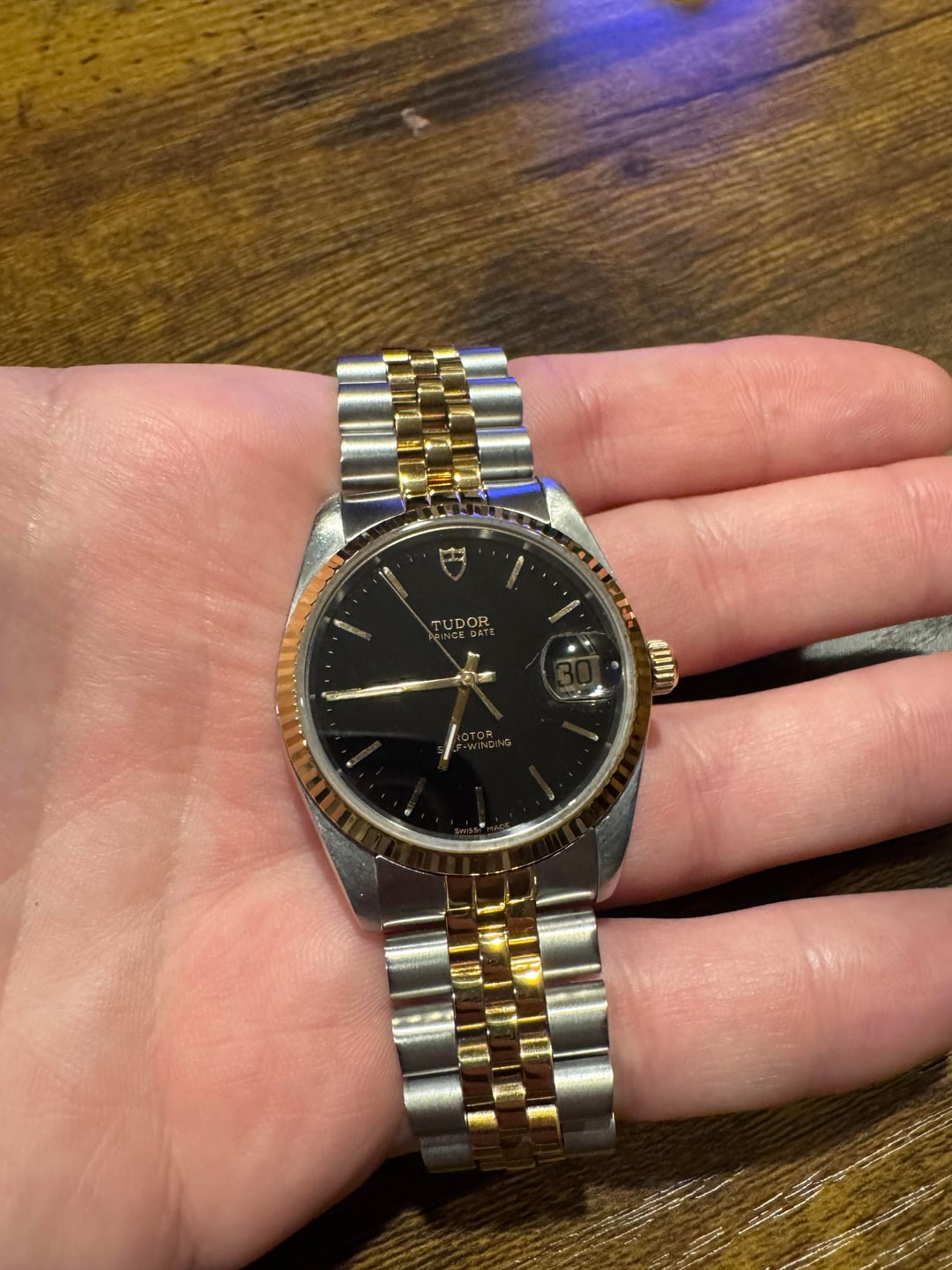 Up for sale is THE CHEAPEST **Tudor Prince Date ref. 74033**, featuring the **rare black dial variant** — a beautiful and less common version of Tudor’s classic two-tone Date model. This piece delivers all the vintage charm of the Rolex Datejust aesthetic but with Tudor’s distinctive character and value. True unpolished example. **Details:** * **Reference:** 74033 * **Case:** Stainless steel with 14k yellow gold fluted bezel * **Dial:** Glossy black with gilt text — rare variant * **Movement:** Tudor-signed ETA 2824-2 automatic * **Bracelet:** Tudor two-tone Jubilee bracelet, correct 455B endlinks * **Crown:** Gold Tudor shield crown * **Caseback:** “Montres Tudor SA Geneva-Switzerland,” marked 8090 * **Condition:** Excellent vintage condition. Bezel retains sharp definition, case shows light wear consistent with age. Dial and hands are clean with warm patina. * **Service:** Recently serviced and running well. * **Included:** Watch only. * **Timestamp:** [**https://imgur.com/a/HTi3ecu**](https://imgur.com/a/HTi3ecu)