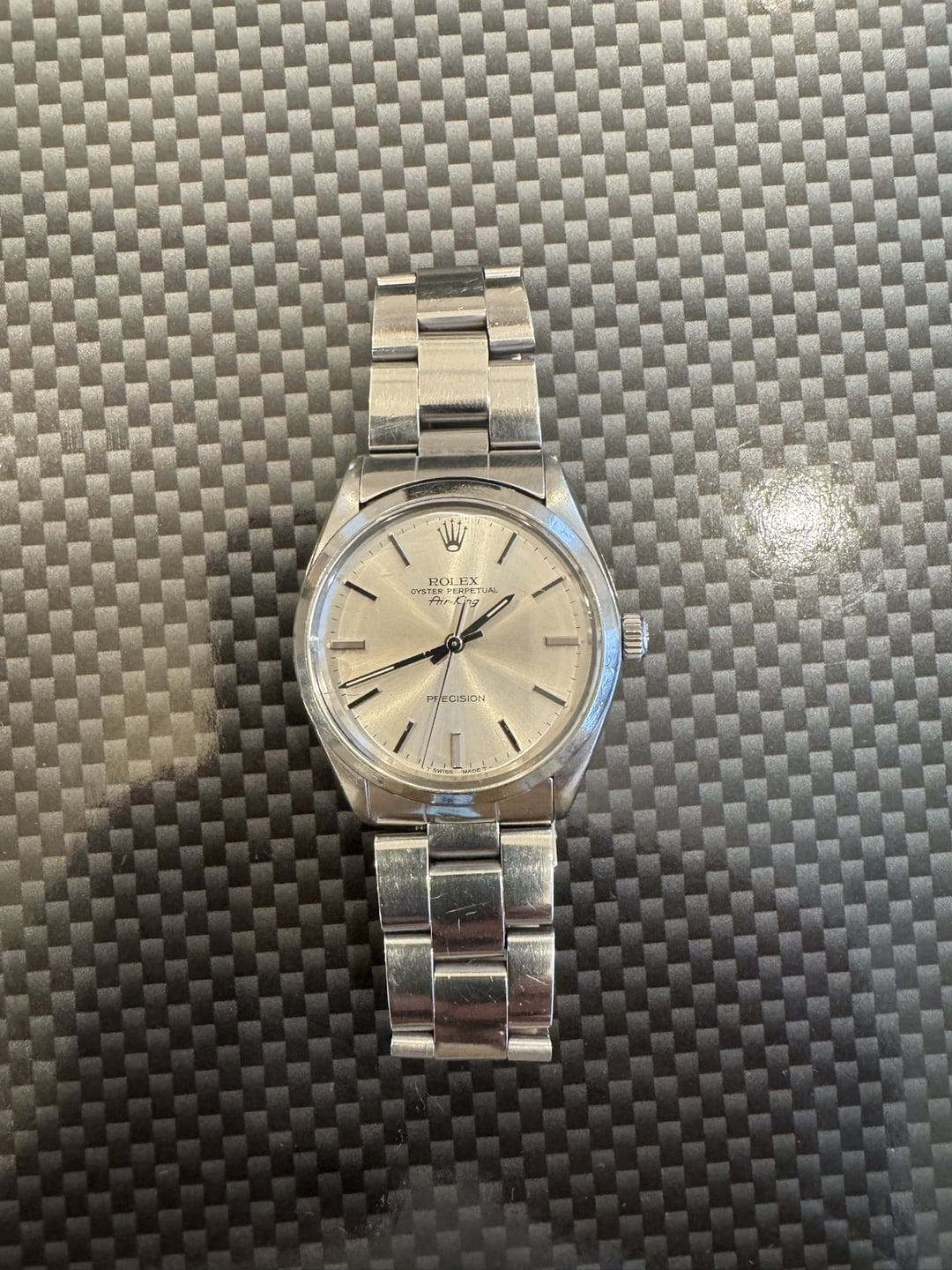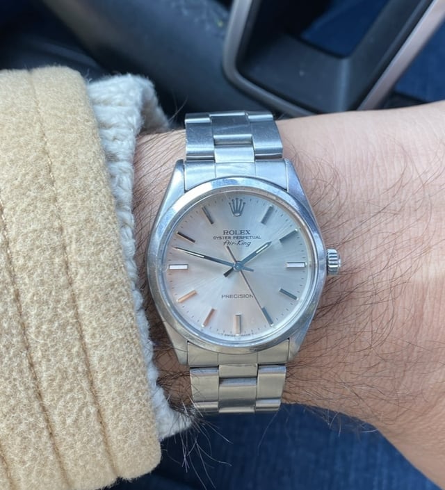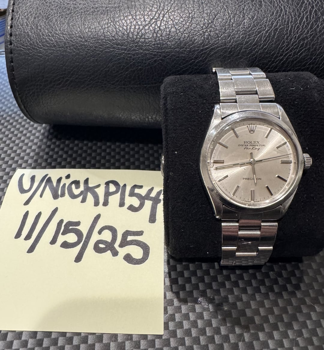 Up for sale is my **1984 Rolex Air-King (Ref. 5500)** featuring the classic **silver sunburst dial** with stick indices and the “**Precision**” marking. This is one of the most iconic and clean vintage Rolex references—simple, reliable, and timeless. # Make & Model: **Rolex Oyster Perpetual Air-King – Ref. 5500** # Year: 1984 (serial aligns with mid-80s production) # Size: 34mm case, \~19mm lug width # Movement: Rolex Cal. 1520 automatic # Case & Crystal: Stainless steel case with acrylic crystal. # Bracelet: Rolex Oyster bracelet (period-correct), normal vintage stretch. # Condition (Honest Description): * Original silver sunburst dial with “Precision” text — clean and even. * Hands and indices in excellent shape. * Case shows normal vintage wear but retains good edge definition. * Acrylic crystal has minor wear appropriate for age. Minor chip at the 9 marker. * Bracelet shows typical stretch for a watch from the early 1980s. * Running well and keeping reliable time (not recently serviced). * No known mechanical issues. # What’s Included: Watch only (no box/papers). # Price: $2,100 USD *Open to reasonable offers. No trades.* # Shipping & Payment: Willing to facetime or Zoom to show the watch in more detail. Addition pictures avaialbe. * **Payment:** Paypal or Zelle preferred. I can do face to face meet up in NY area. * **Location:** NYC.