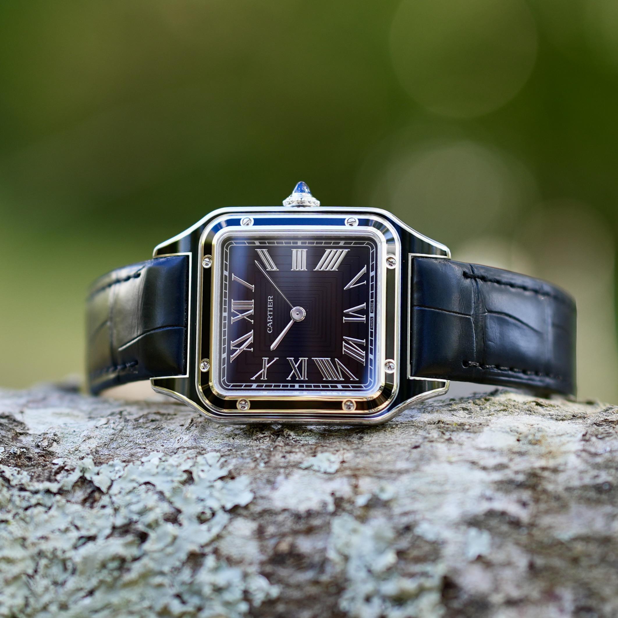 2025 Cartier Santos-Dumont Price: $7,750 Reference Number: WSSA0046 Condition: New | Complete Logistics Location: US - Georgia Payment: Bank Wire Shipping: Free to CONUS | Fully insured via FedEx Media Album with Timestamp: https://imgur.com/a/xw34ev4 Details Hi, Reddit. Very excited to bring an incredible piece today. This is the Cartier Santos-Dumont, a Non-U.S. Boutique-exclusive model; you cannot simply walk into Cartier and request it. Even more exciting than its exclusivity, to me, is the history: The namesake of this model, Alberto Santos-Dumont, a renowned pilot at the time, requested a watch from his friend Louis Cartier that would allow him to read the time without having to remove his hands from the controls of his plane (everything available to men before this was a pocket watch). Cartier accepted the request, and from it was born the first-ever men’s wristwatch—the Cartier Santos-Dumont—in 1904. This piece is an homage to that remarkable history, and is truly incredible. MSRP = €8,350 ($9,700) Specs: 43.5 mm x 31.4 mm Translucent Black Lacquer dial Black accented bezel Black Alligator leather strap Blue Spinel Cabochon This watch is presented as Brand New and Unworn (secured tag still intact), dated 08/2025, and comes as a complete set with inner and outer boxes, tag, warranty card, and watch. I’m happy to answer any and all questions, as well as facetime with the watch. Reasonable offers or trades considered. Carat & Calibre GA buyers subject to sales tax